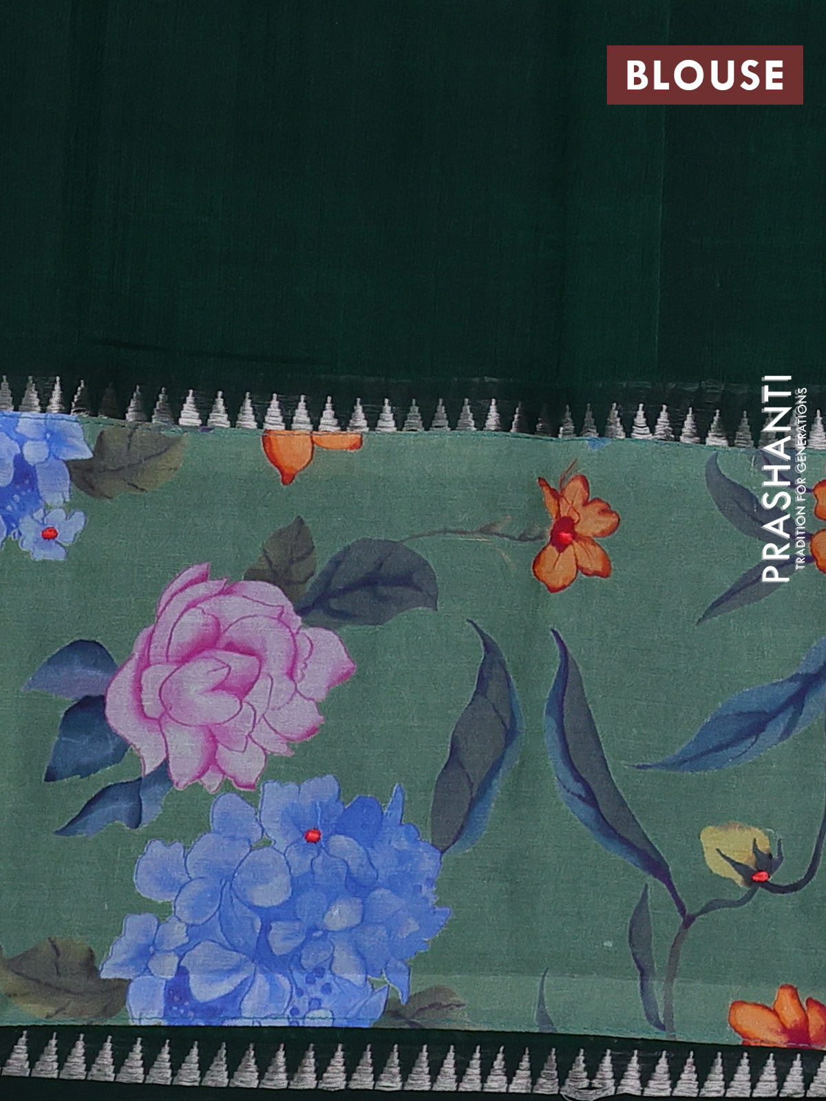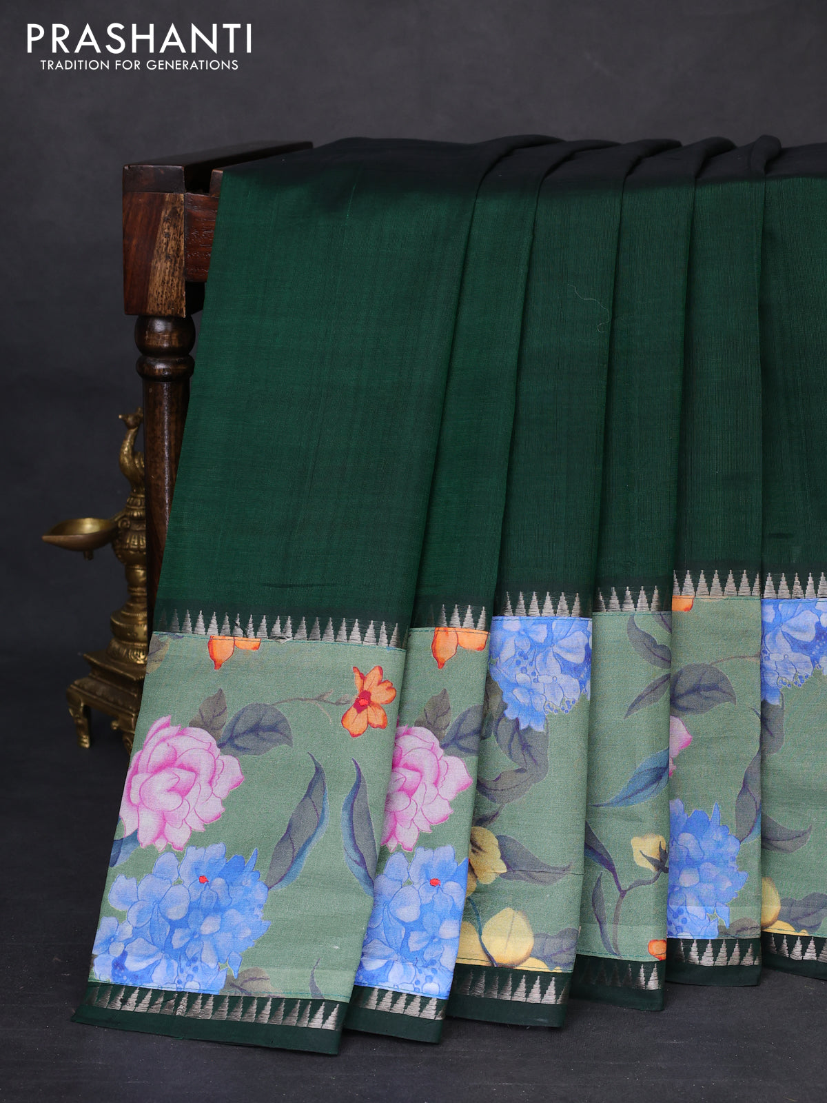 Mangalgiri silk cotton saree bottle green and pastel green with plain body and temple design kalamkari printed applique border