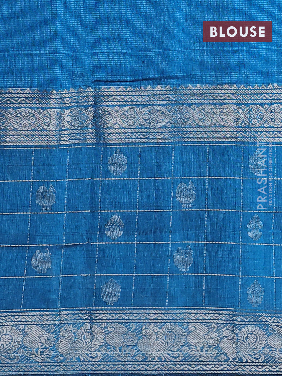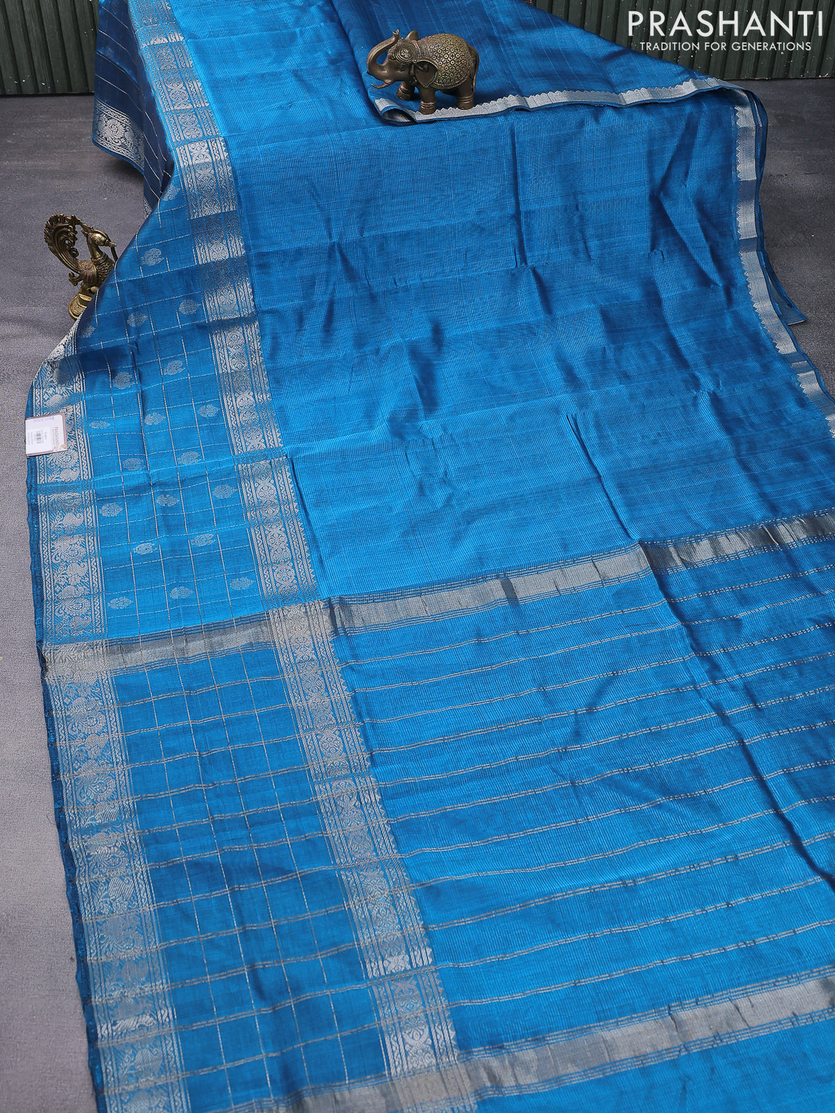 Mangalgiri silk cotton saree cs blue with plain body and long silver zari checked border