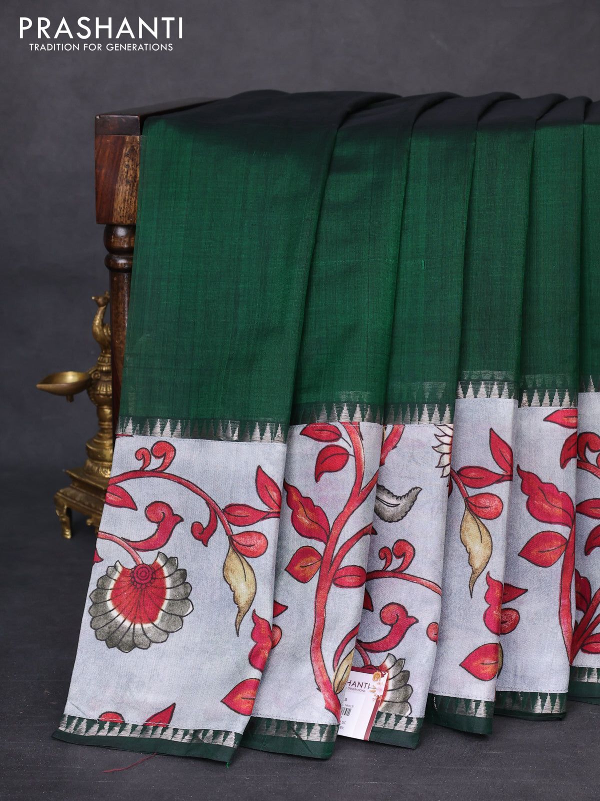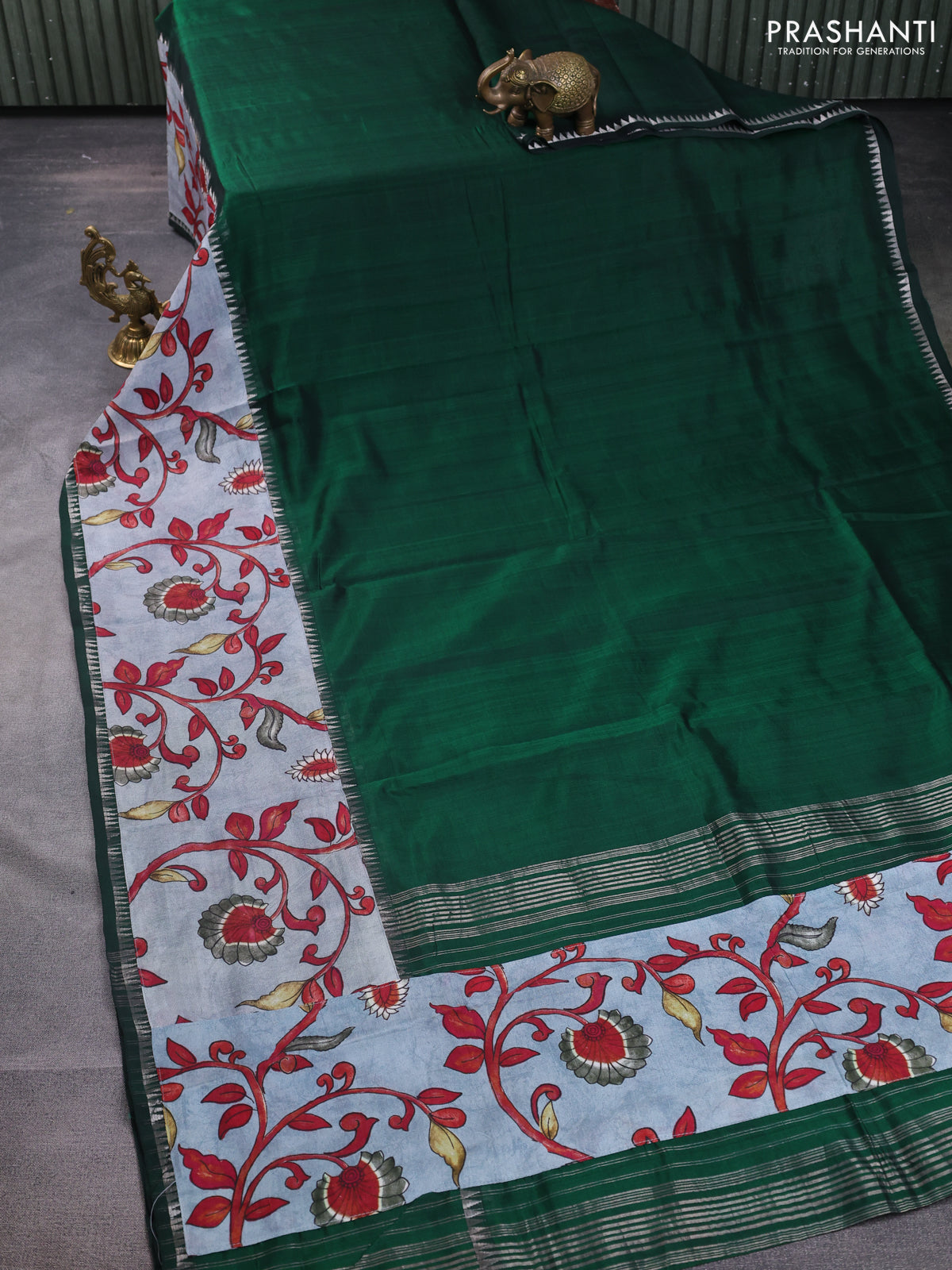 Mangalgiri silk cotton saree dark green and grey with plain body and temple design kalamkari printed applique border