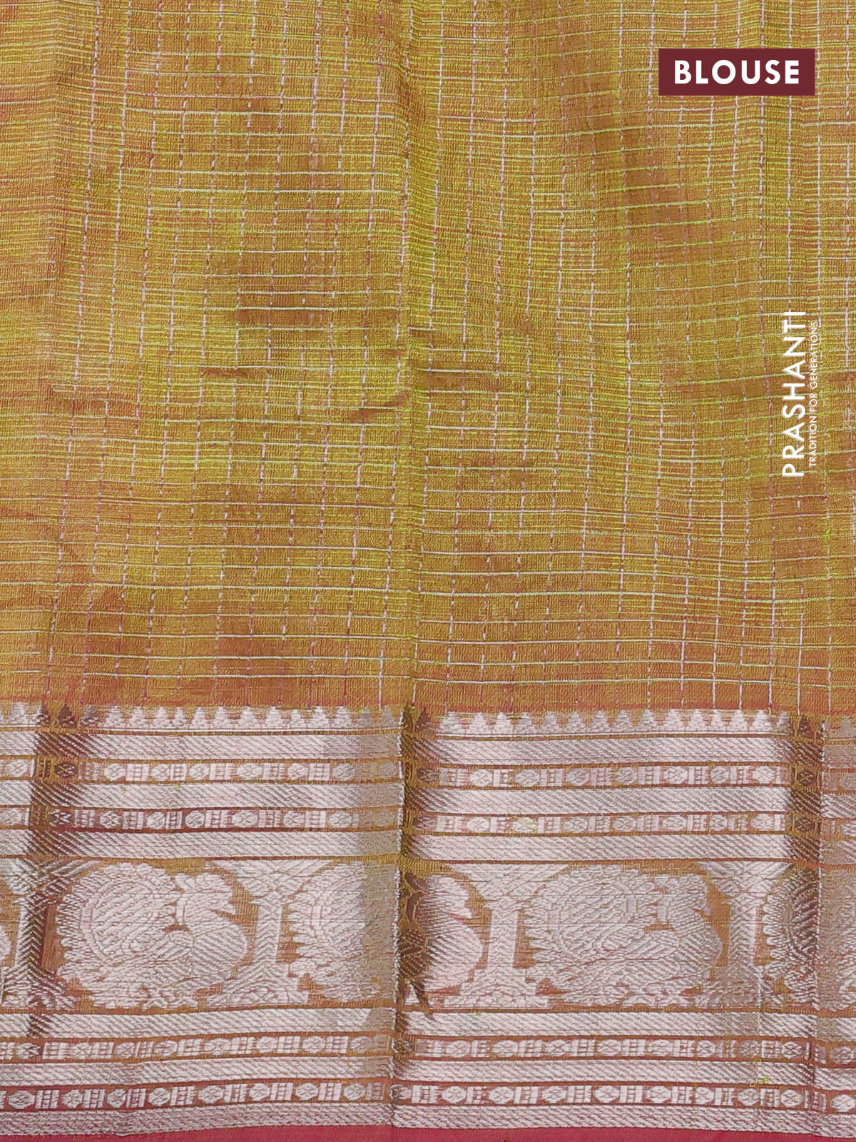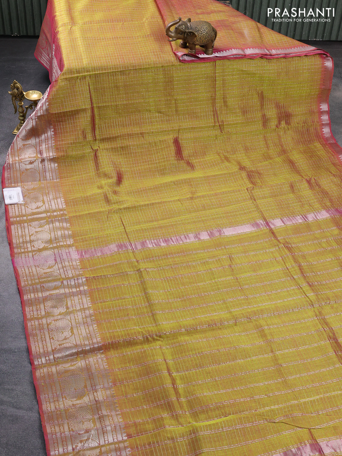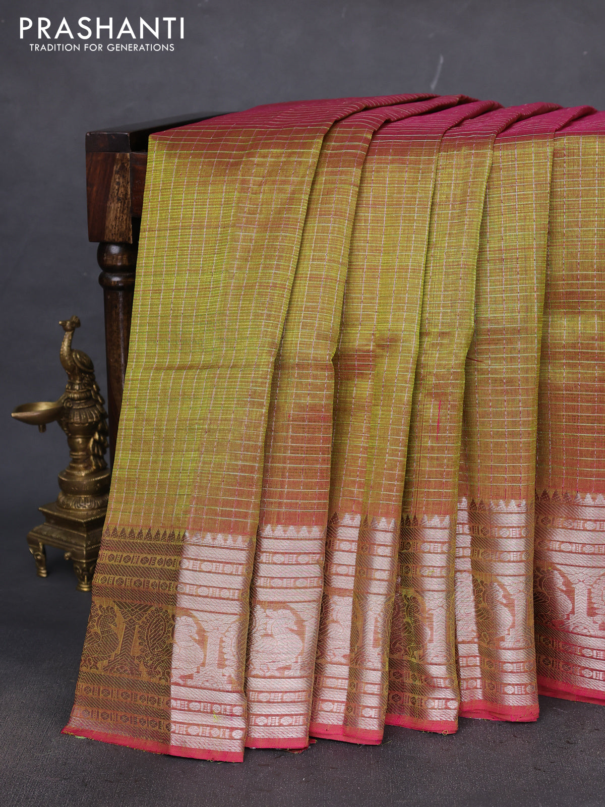 Mangalgiri silk cotton saree dual shade of mehendi greenish pink with allover zari woven checked pattern and annam silver zari woven border