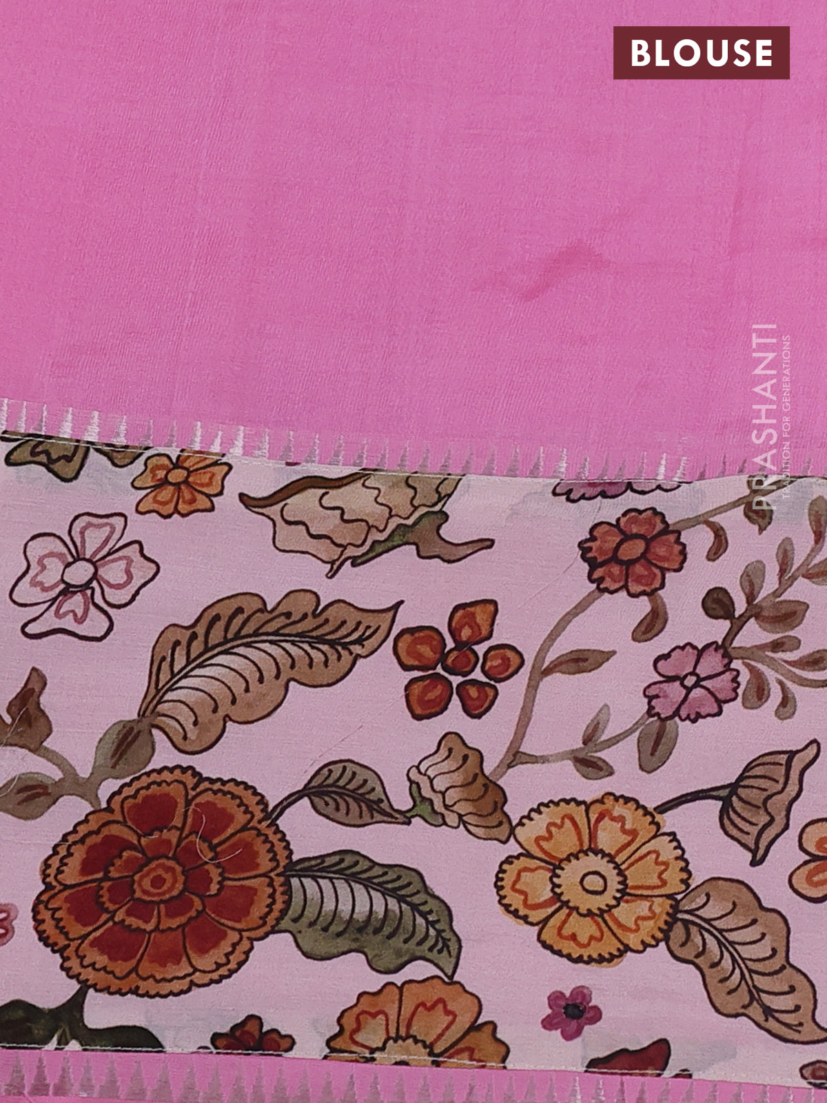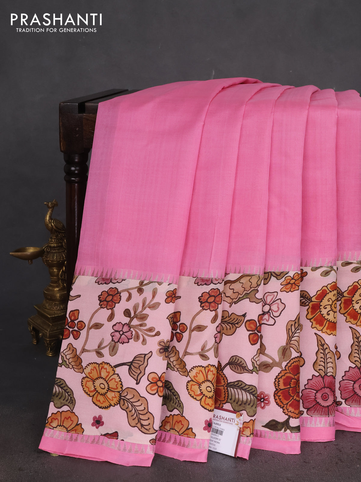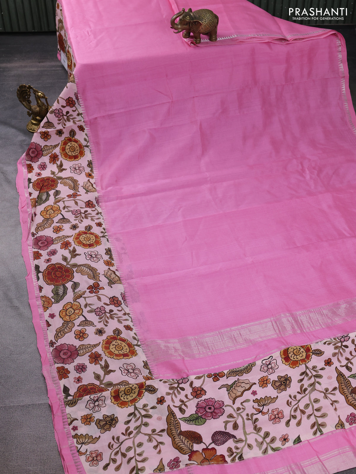 Mangalgiri silk cotton saree light pink and pastel peach pink with plain body and long kalamkari printed applique border