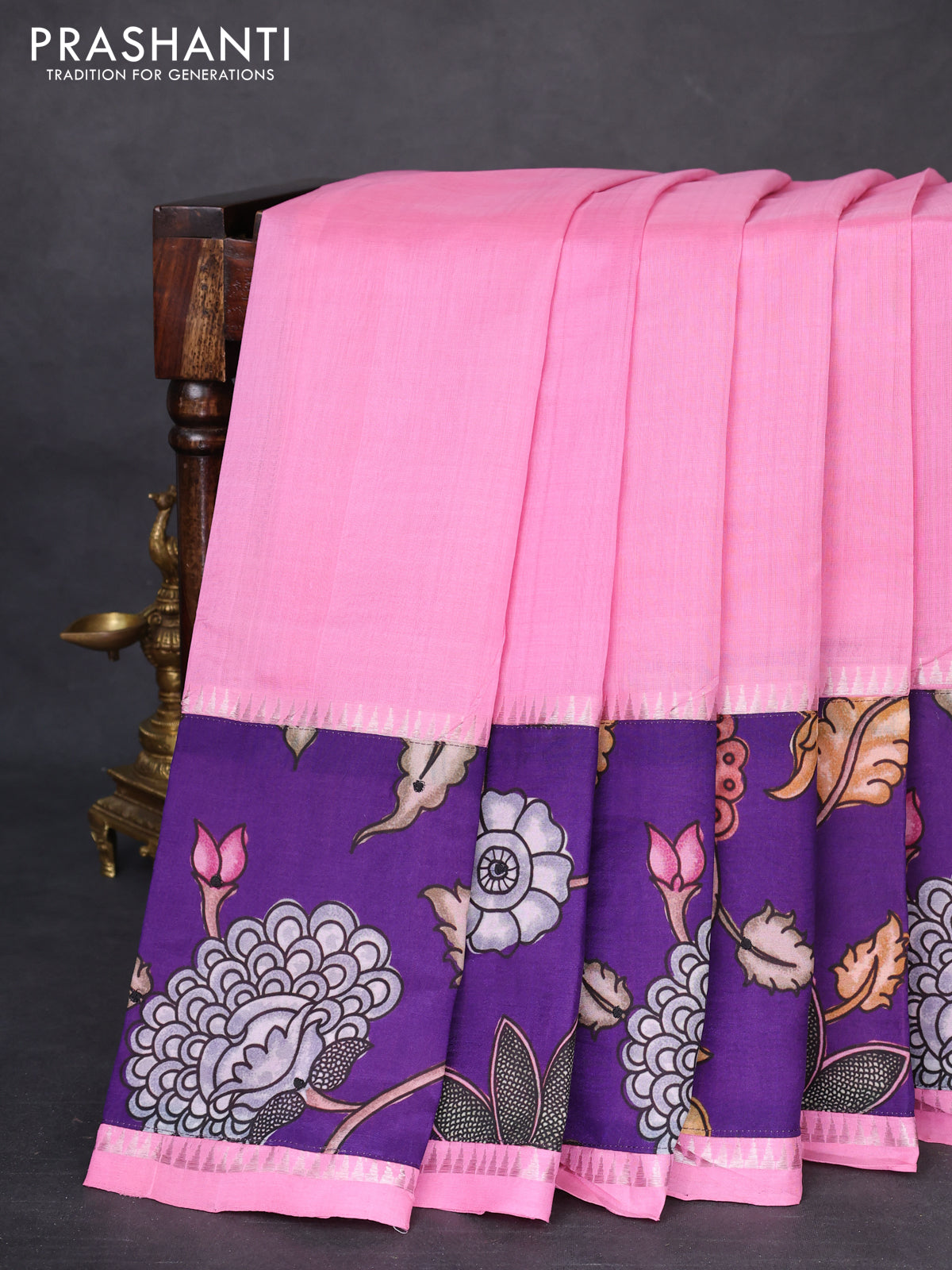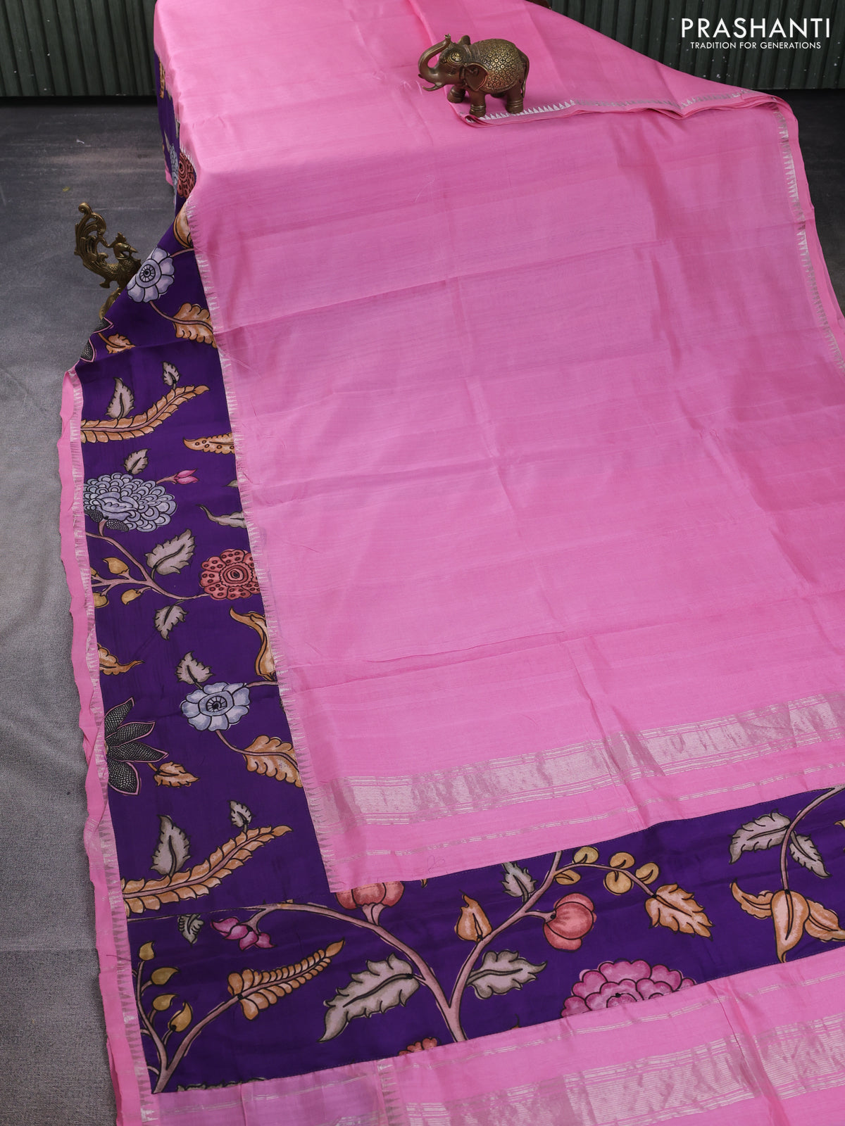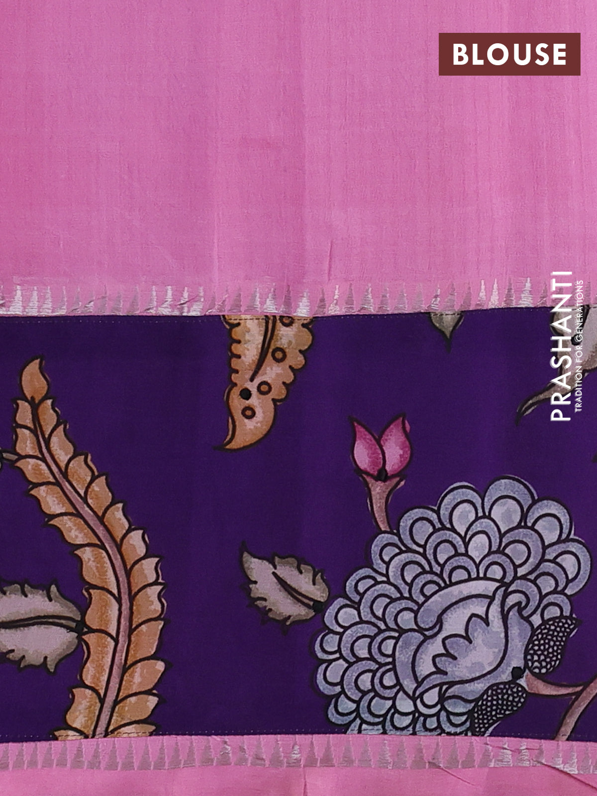Mangalgiri silk cotton saree light pink and violet with plain body and temple design kalamkari printed applique border