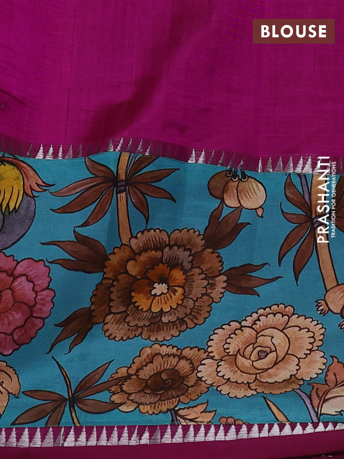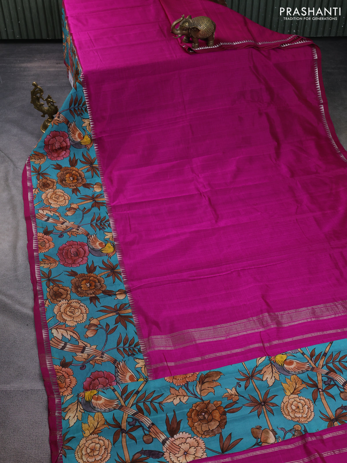 Mangalgiri silk cotton saree magenta pink and teal blue with plain body and temple design kalamkari printed applique border