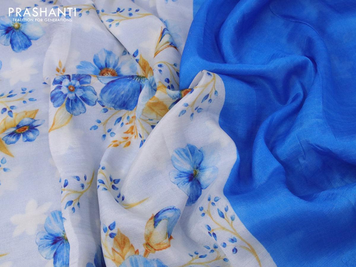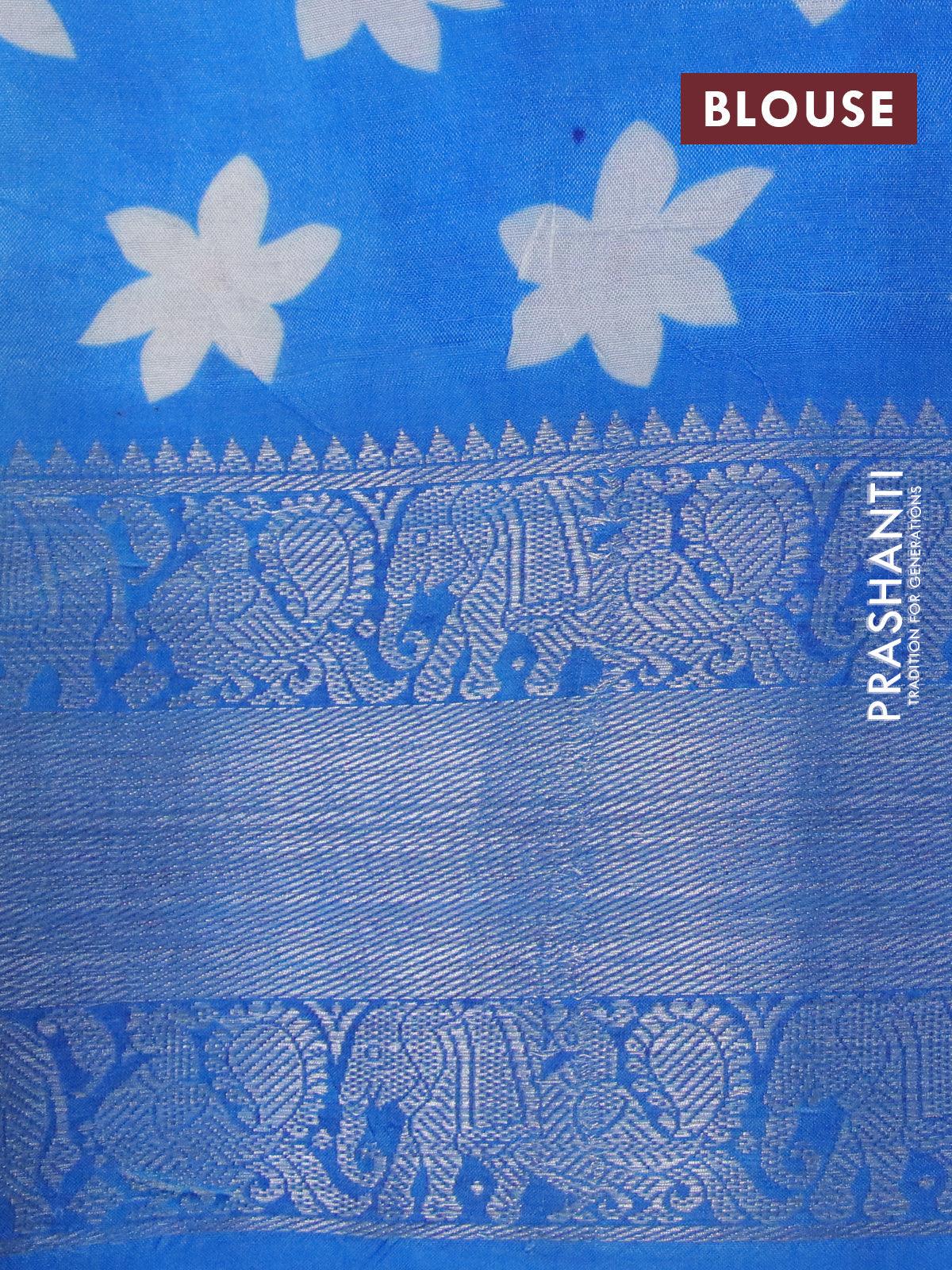Mangalgiri silk cotton saree off white and cs blue with allover floral prints and annam & elephant design silver zari woven border