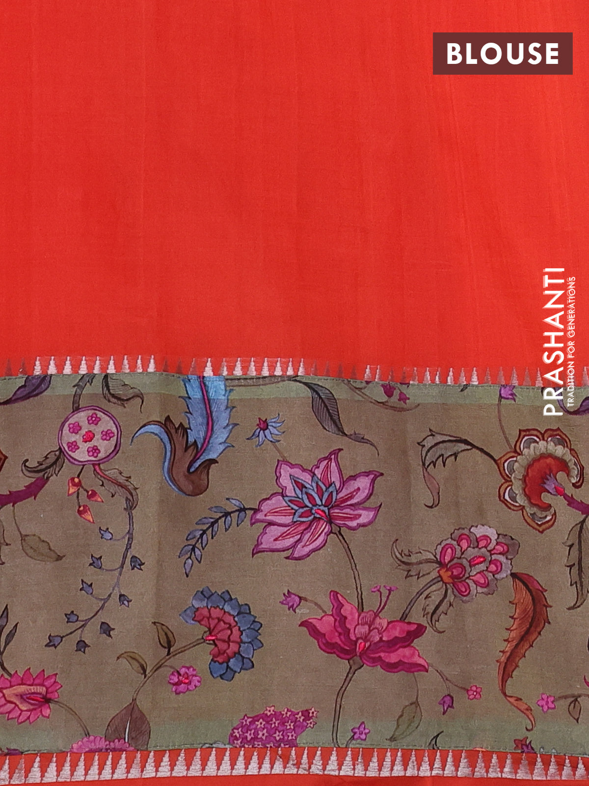 Mangalgiri silk cotton saree orange and chikku shade with plain body and temple design kalamkari printed applique border