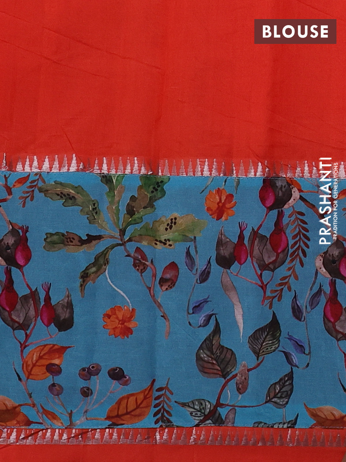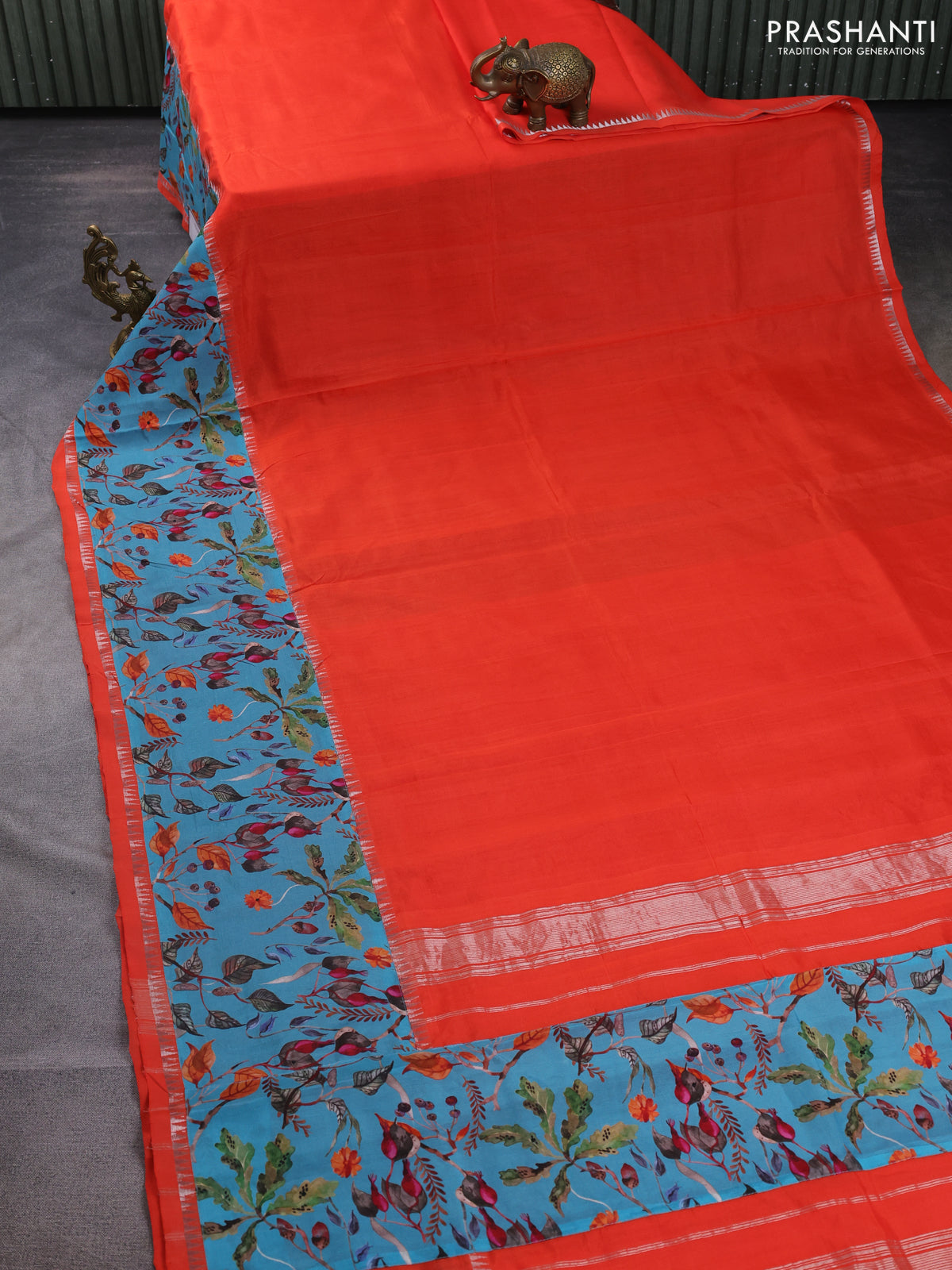 Mangalgiri silk cotton saree orange and teal blue with plain body and temple design kalamkari printed applique border