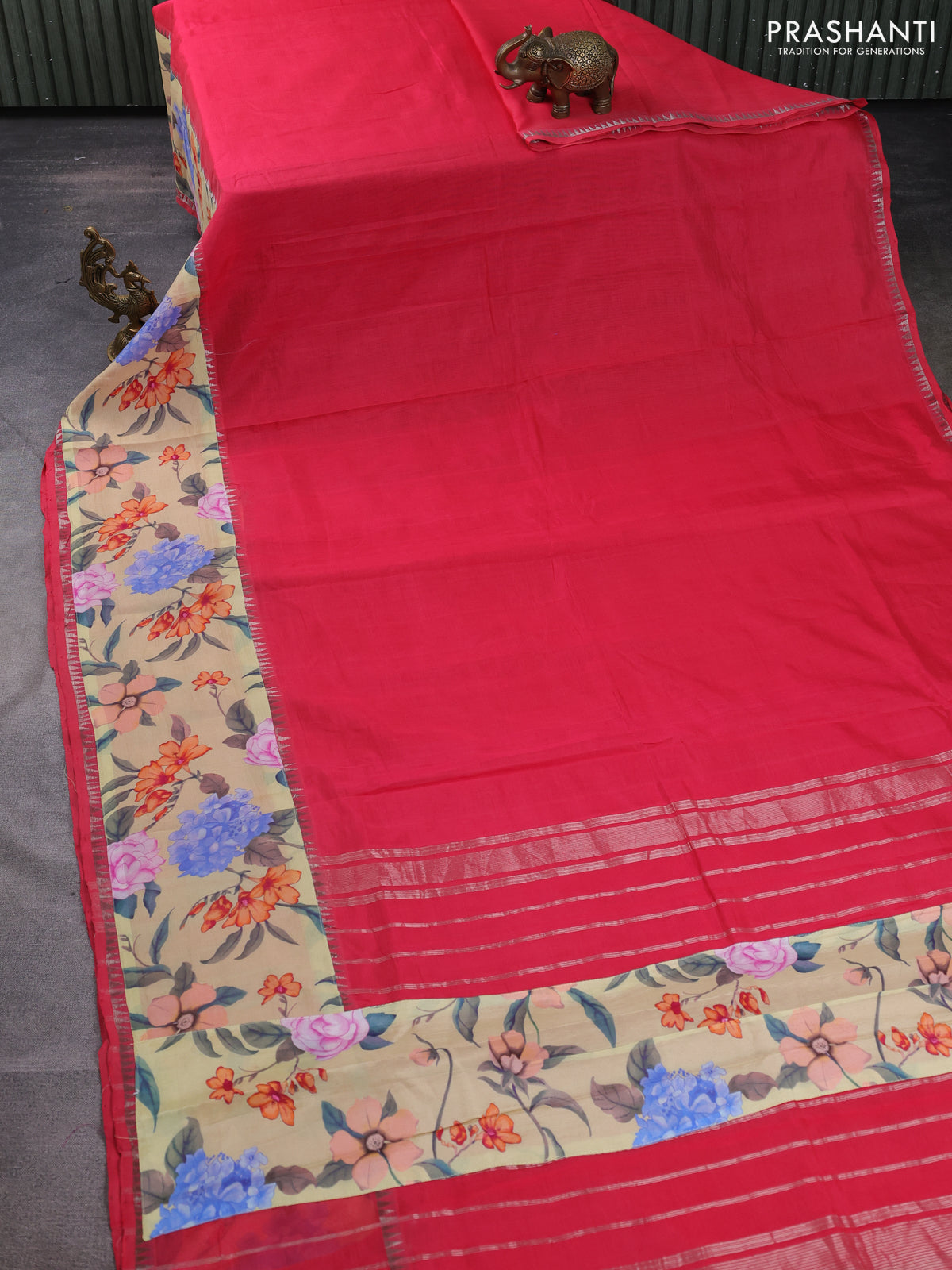 Mangalgiri silk cotton saree pink shade and sandal with plain body and temple design kalamkari printed applique border