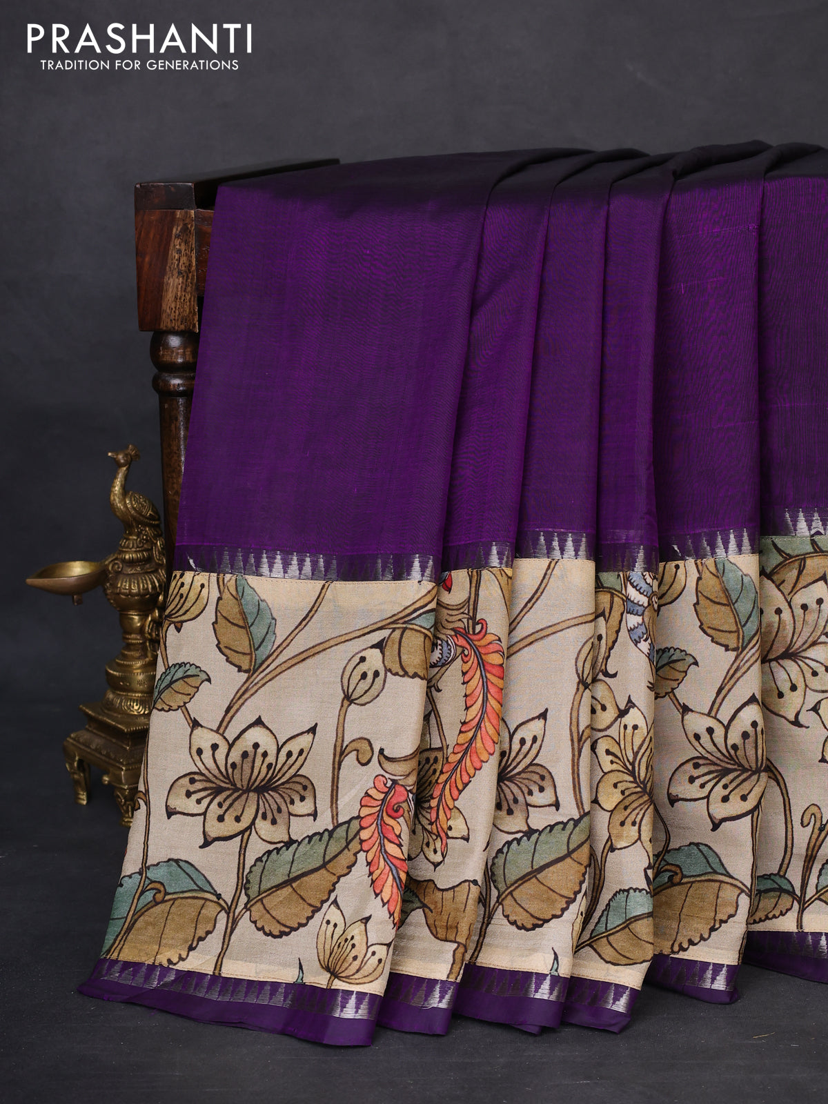 Mangalgiri silk cotton saree violet and beige with plain body and temple design kalamkari printed applique border