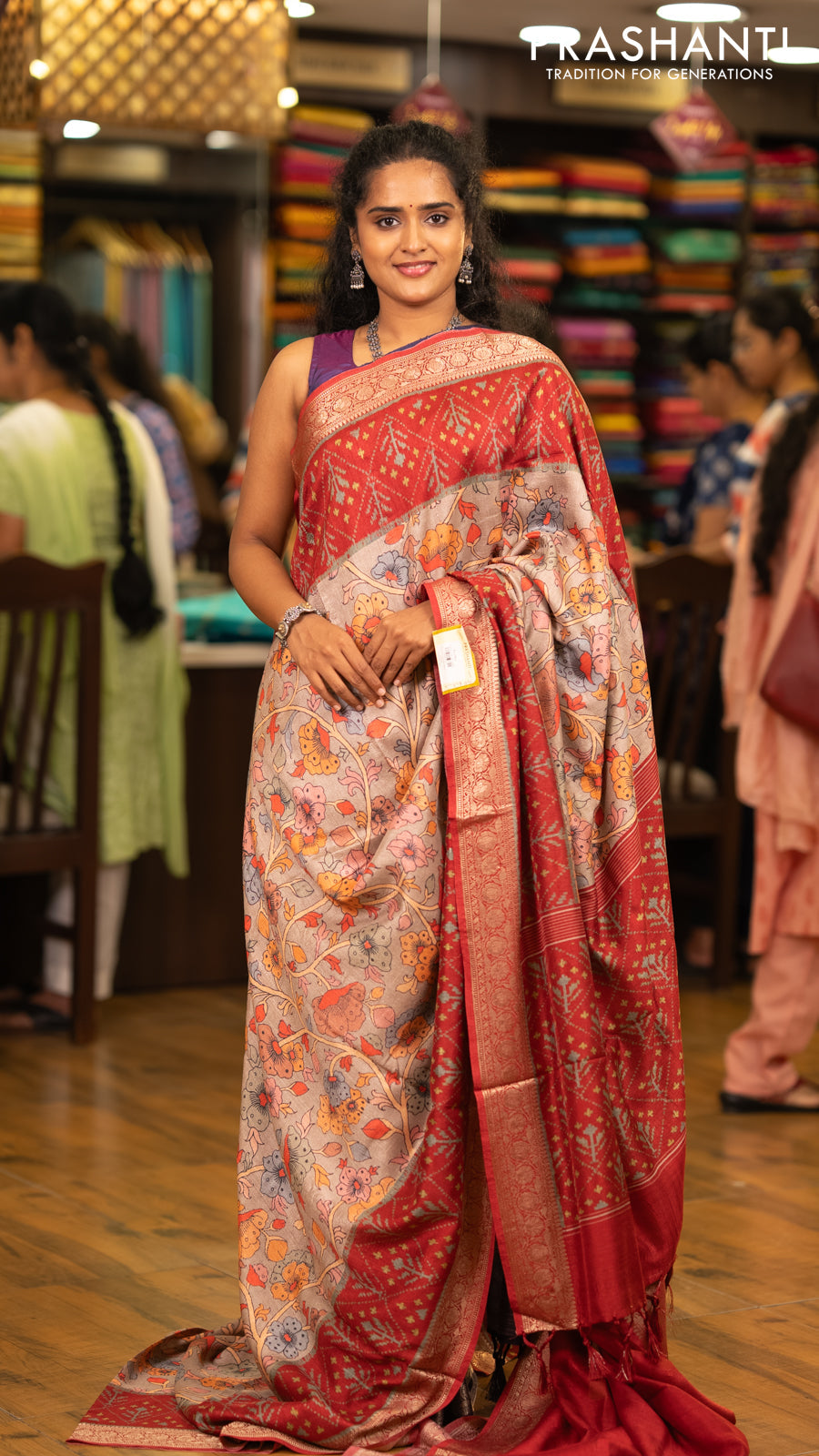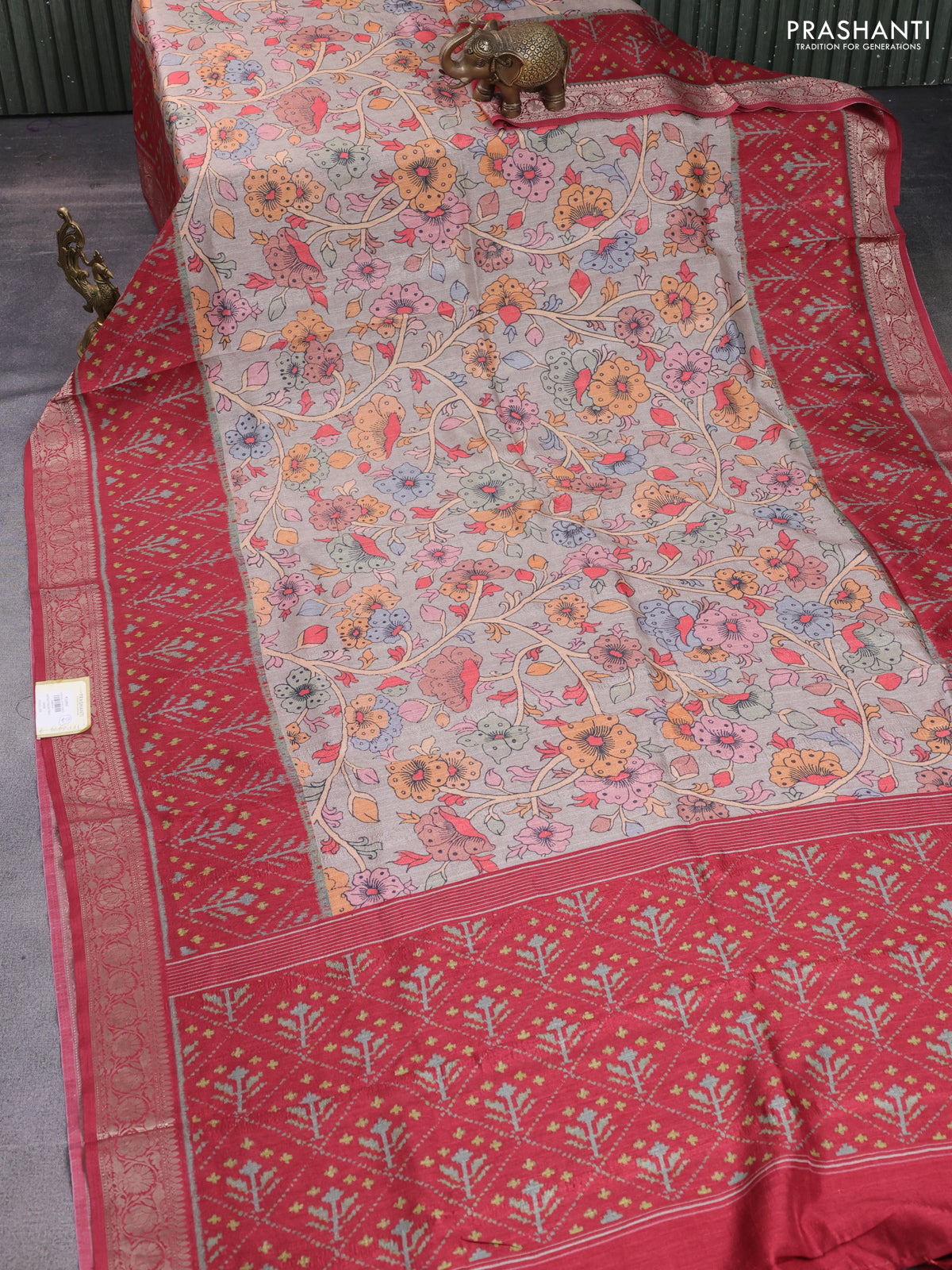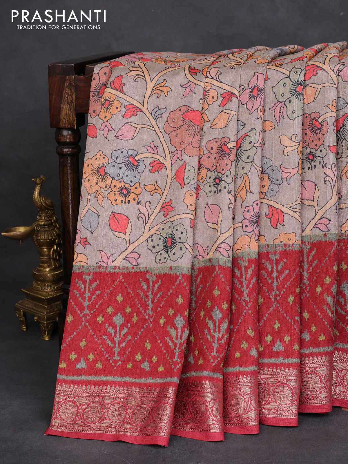 Matka tussar saree beige and maroon with allover kalamkari prints and zari woven border
