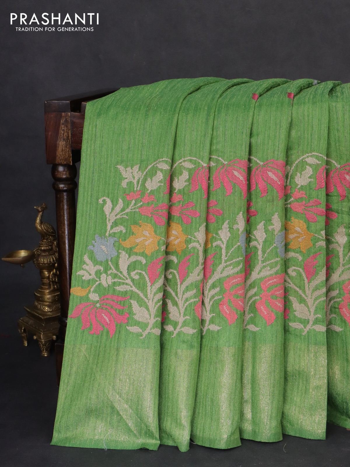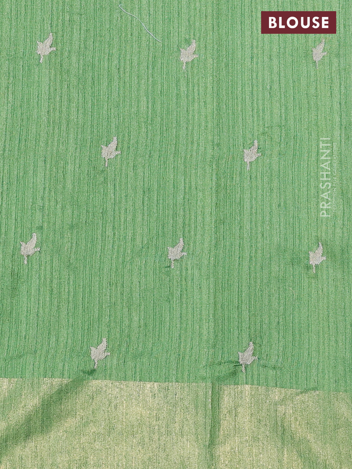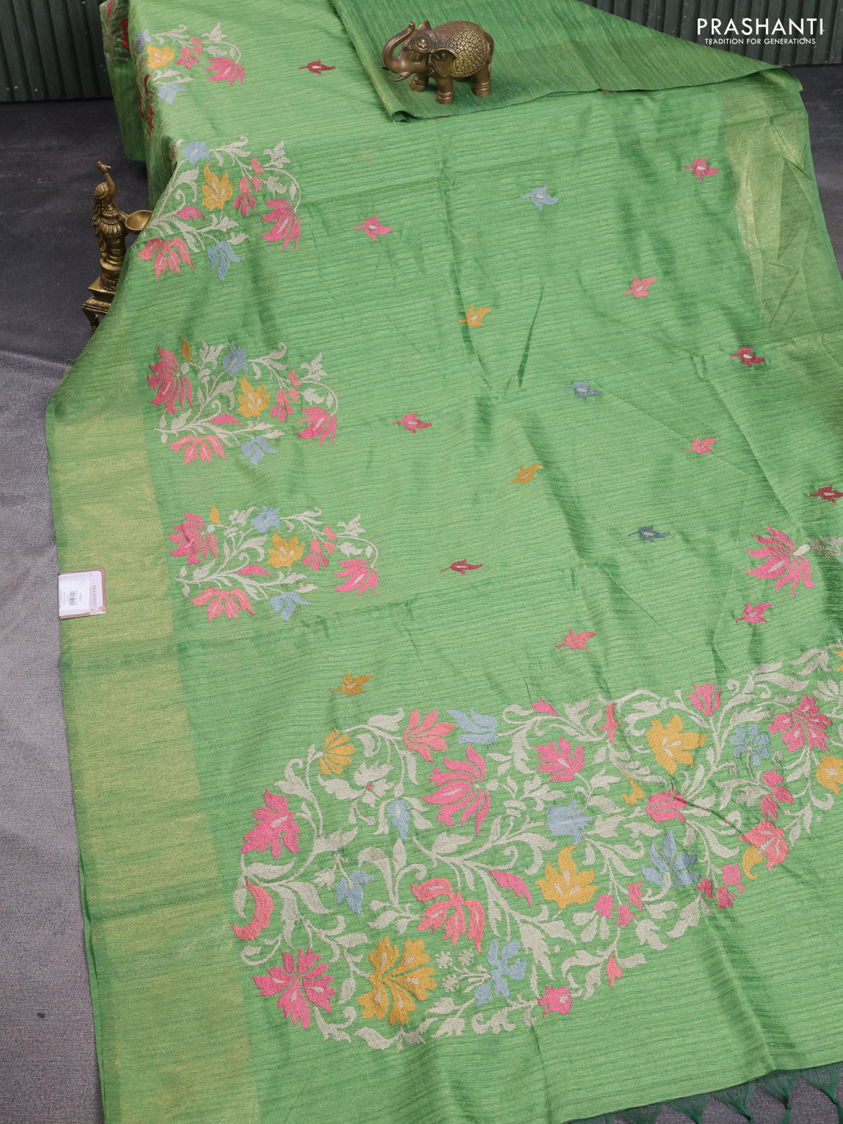Matka tussar saree green with embroidery buttas and embroidery pallu & zari border