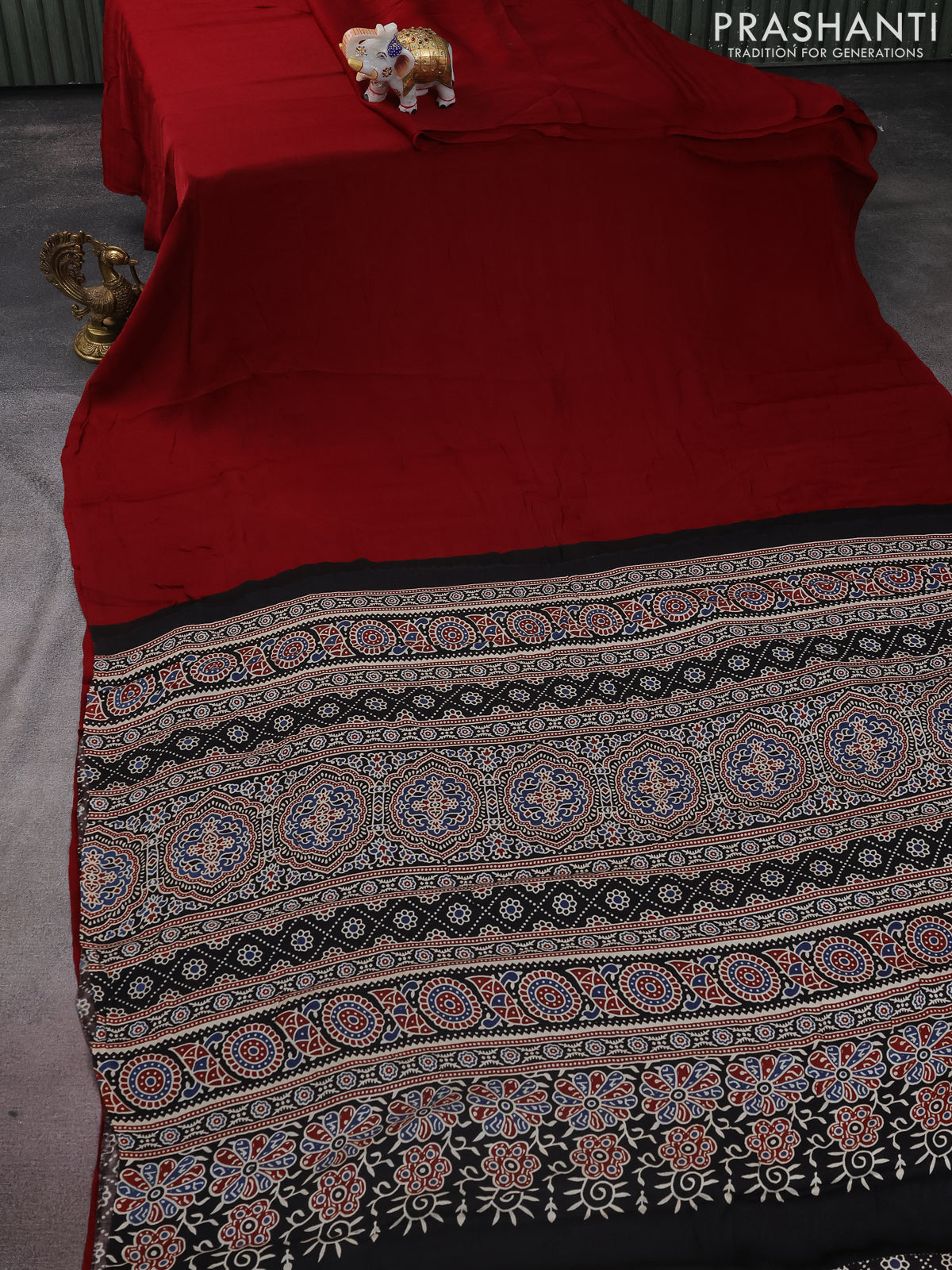Modal silk saree maroon and black with plain body and ajrakh printed pallu & blouse