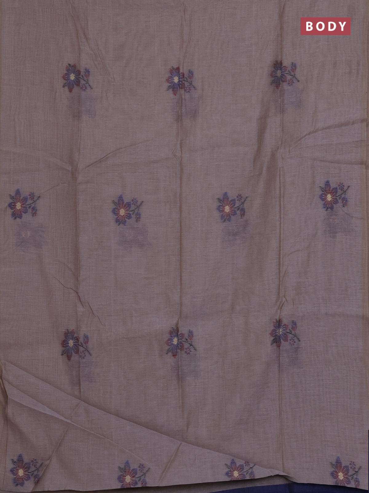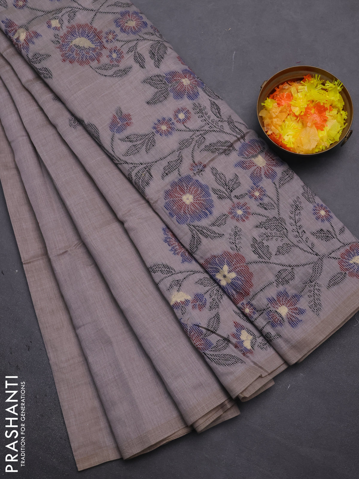 Munga cotton saree grey and blue with thread woven floral buttas and floral design weaving pallu
