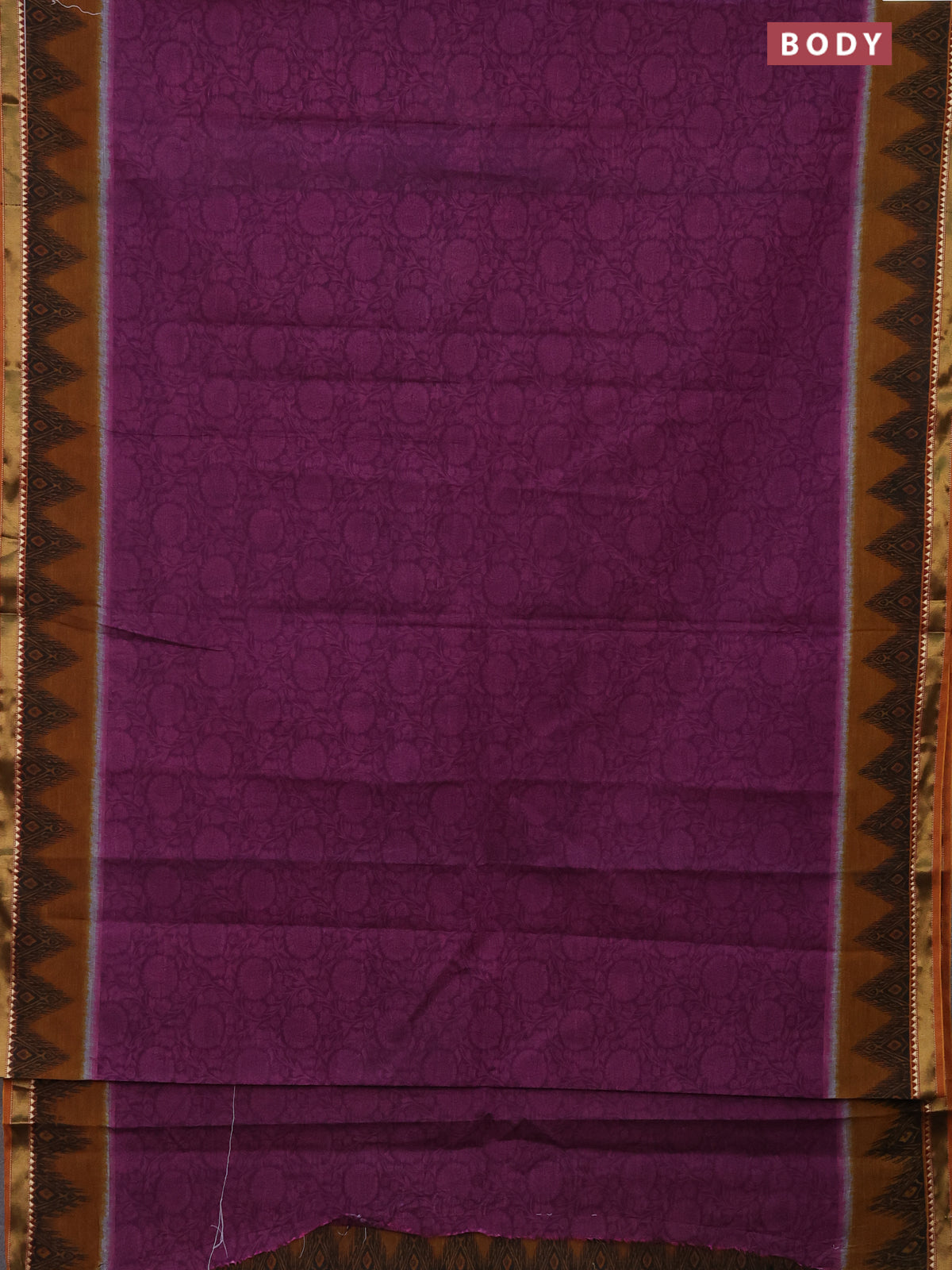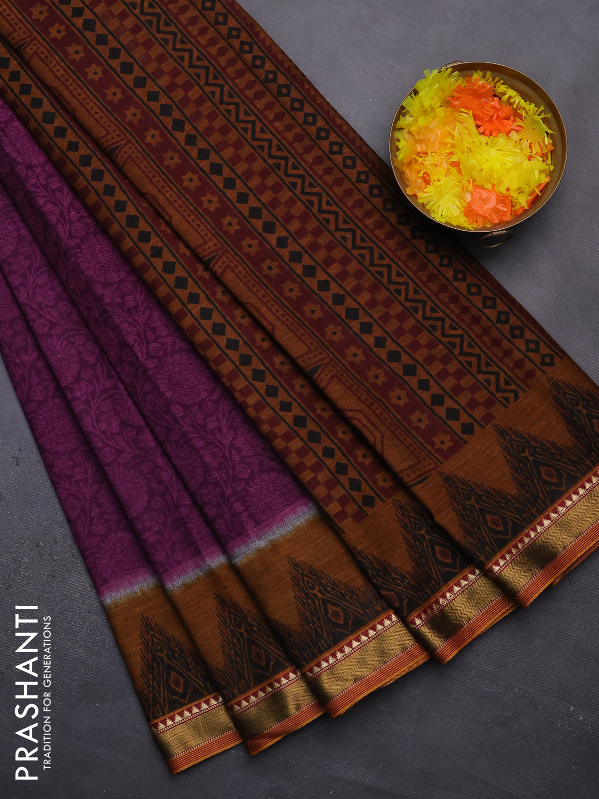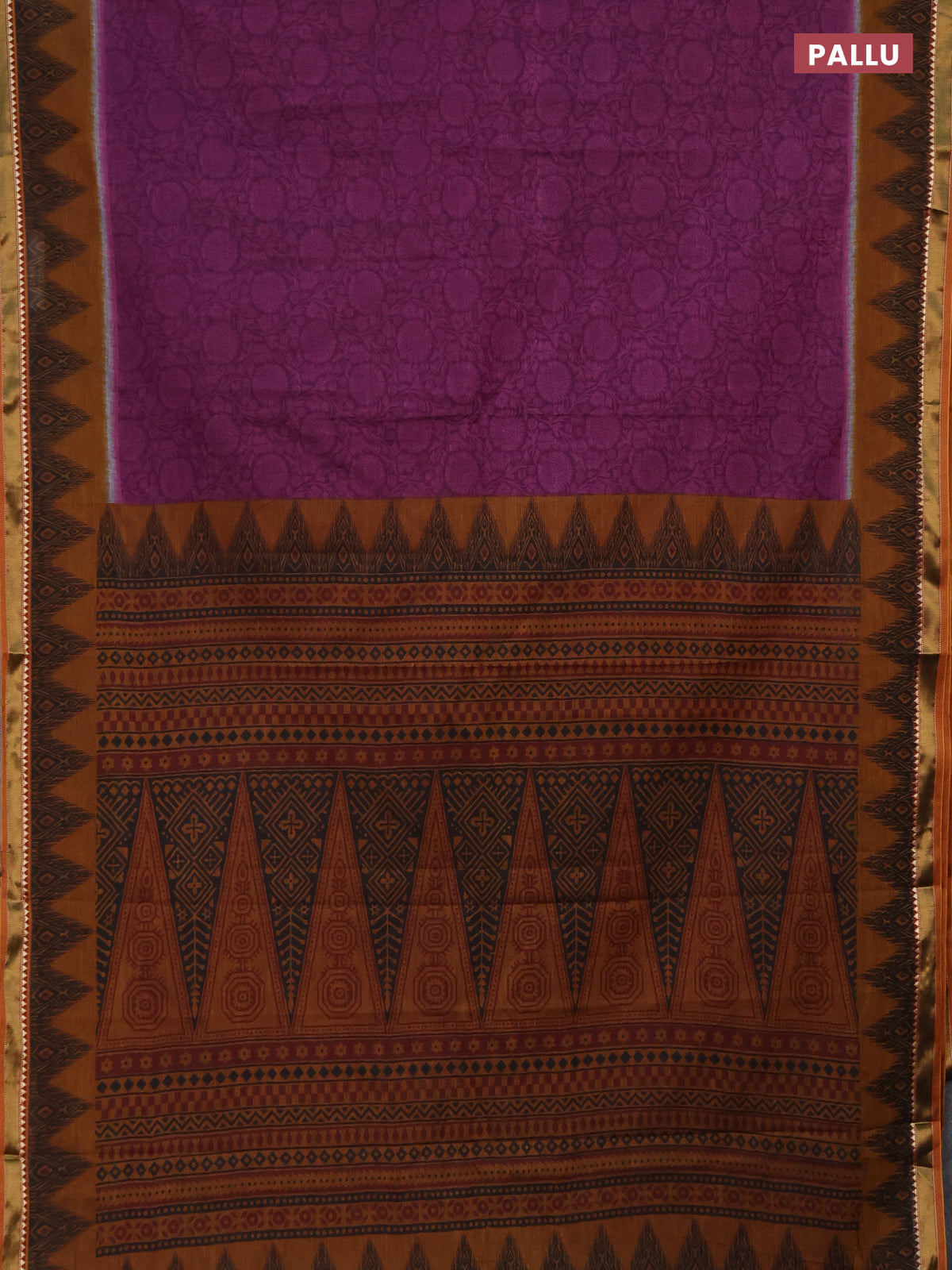 Muslin cotton saree purple and dark mustard with allover prints and zari woven border