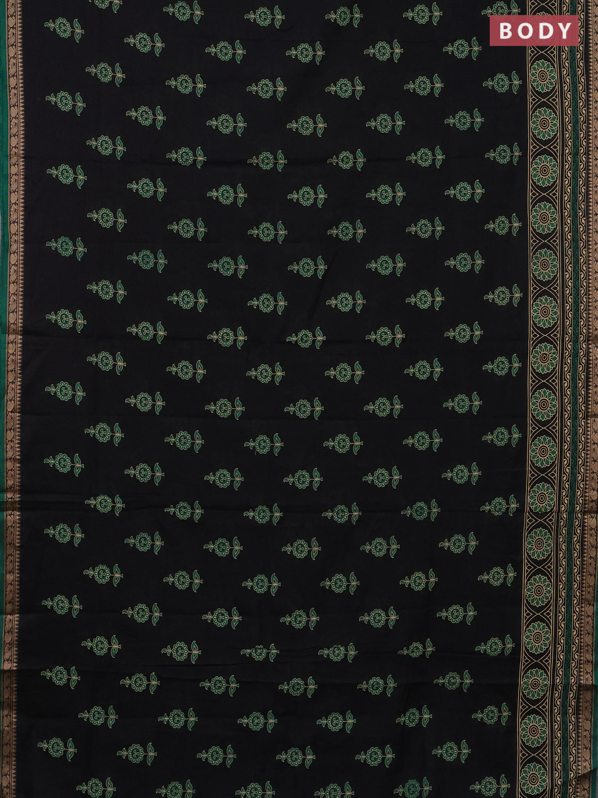 Narayanpet cotton saree black and green with block prints and thread woven border
