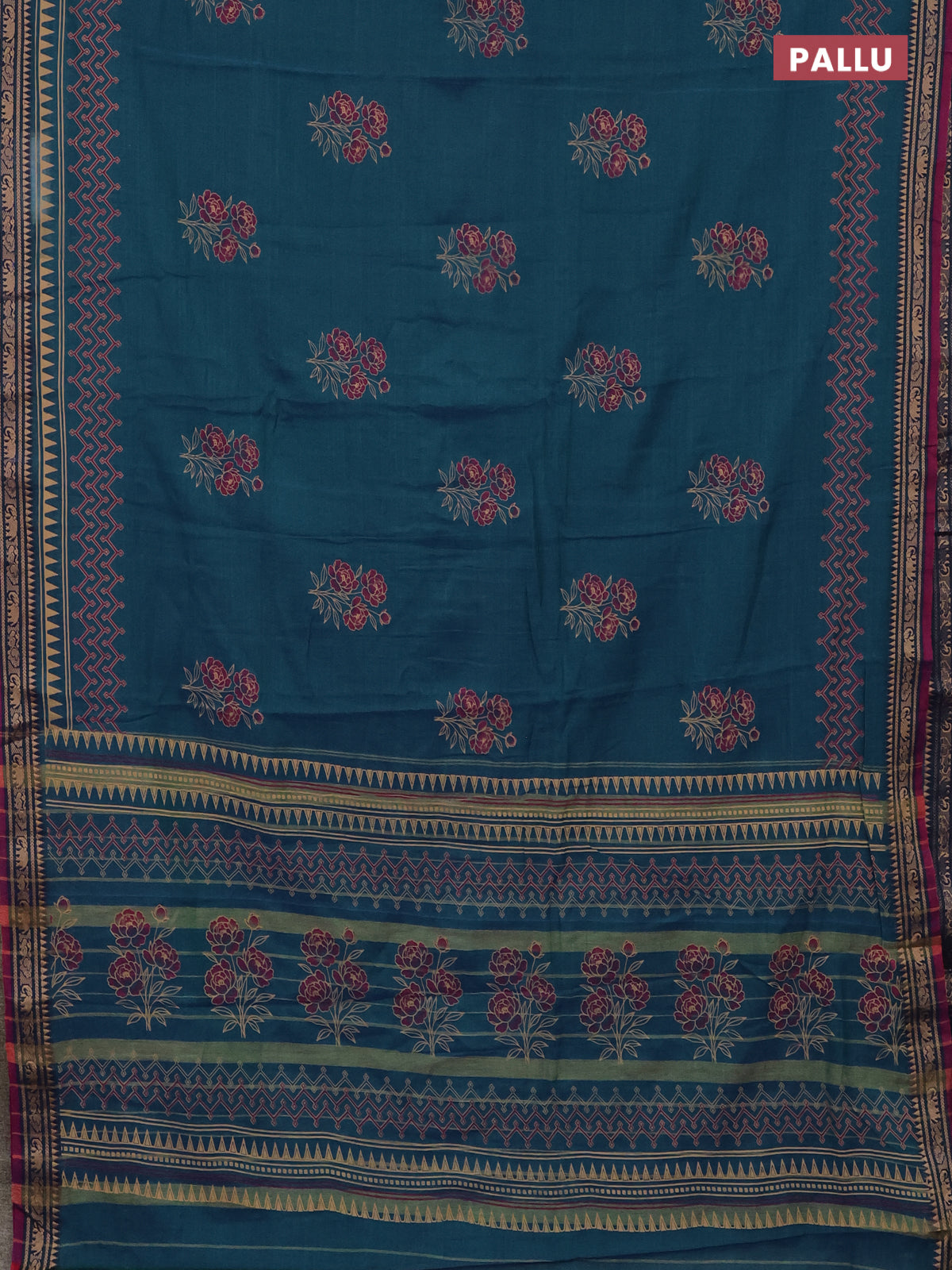 Narayanpet cotton saree dual shade of bluish green and dual shade of purple with block prints and thread woven border