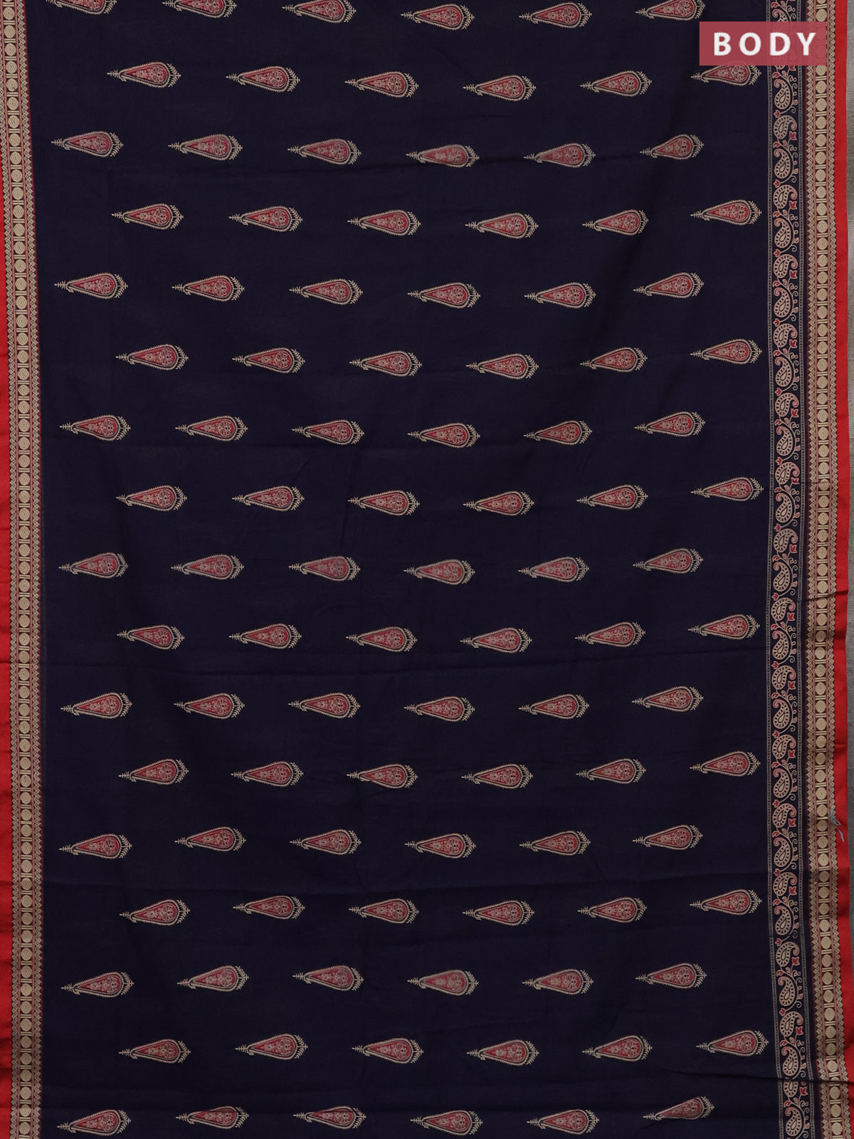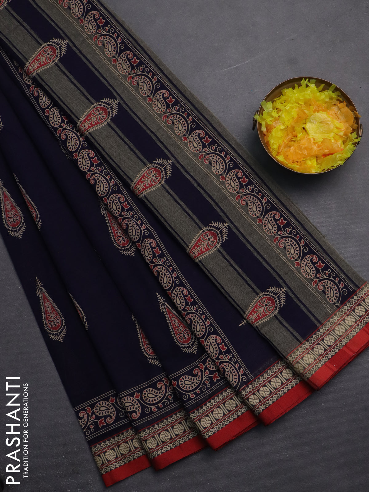 Narayanpet cotton saree navy blue and red with block prints and thread woven border
