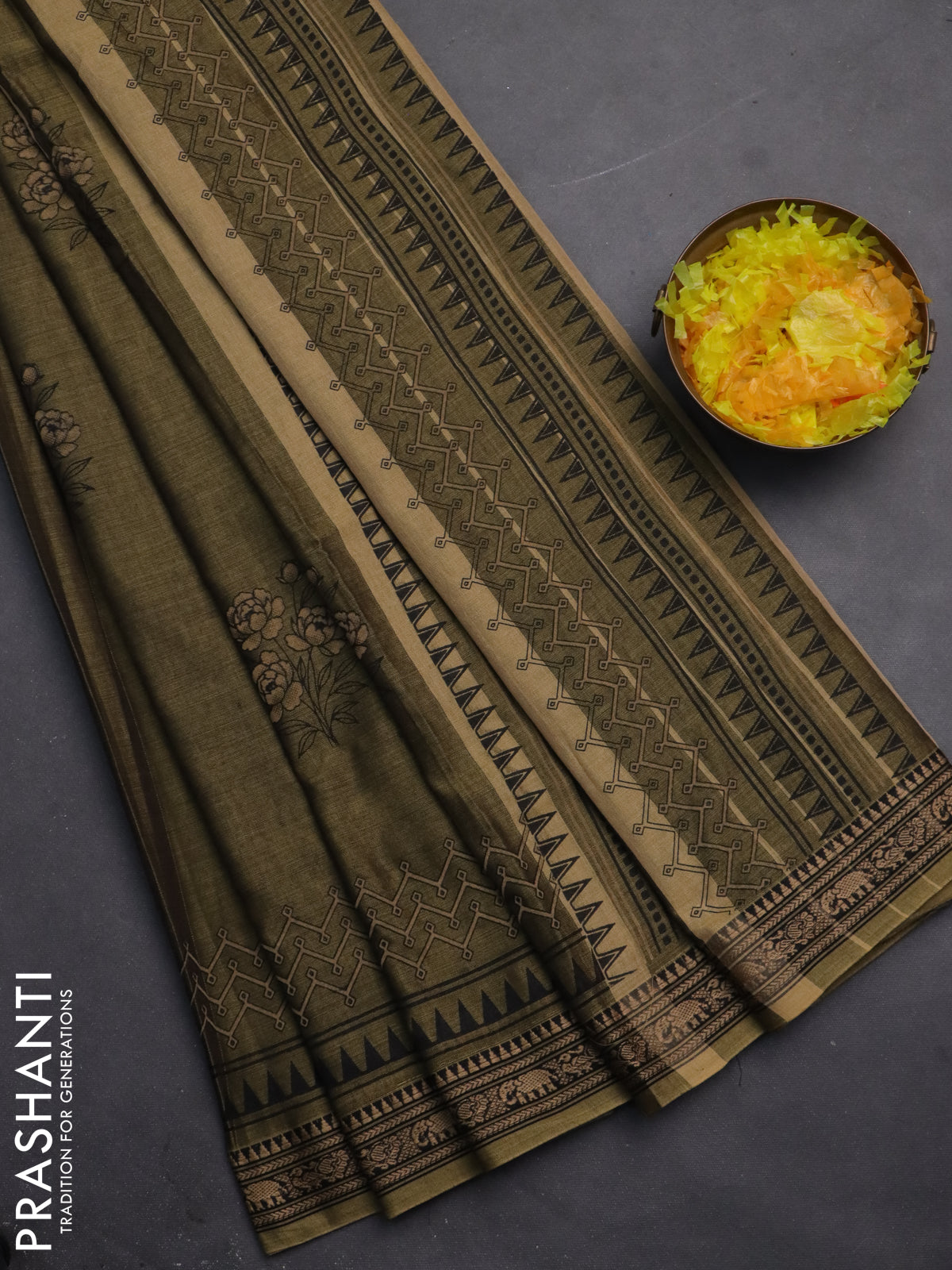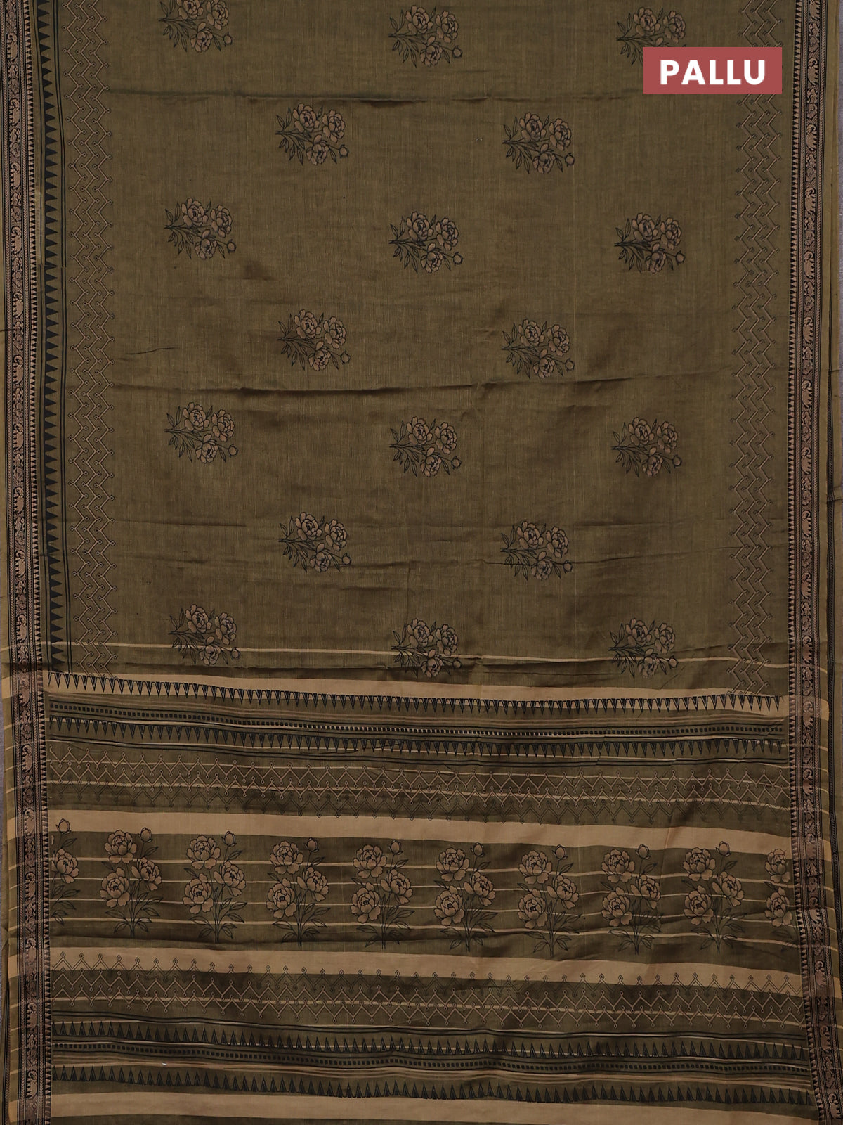 Narayanpet cotton saree olive green and black with block prints and thread woven border