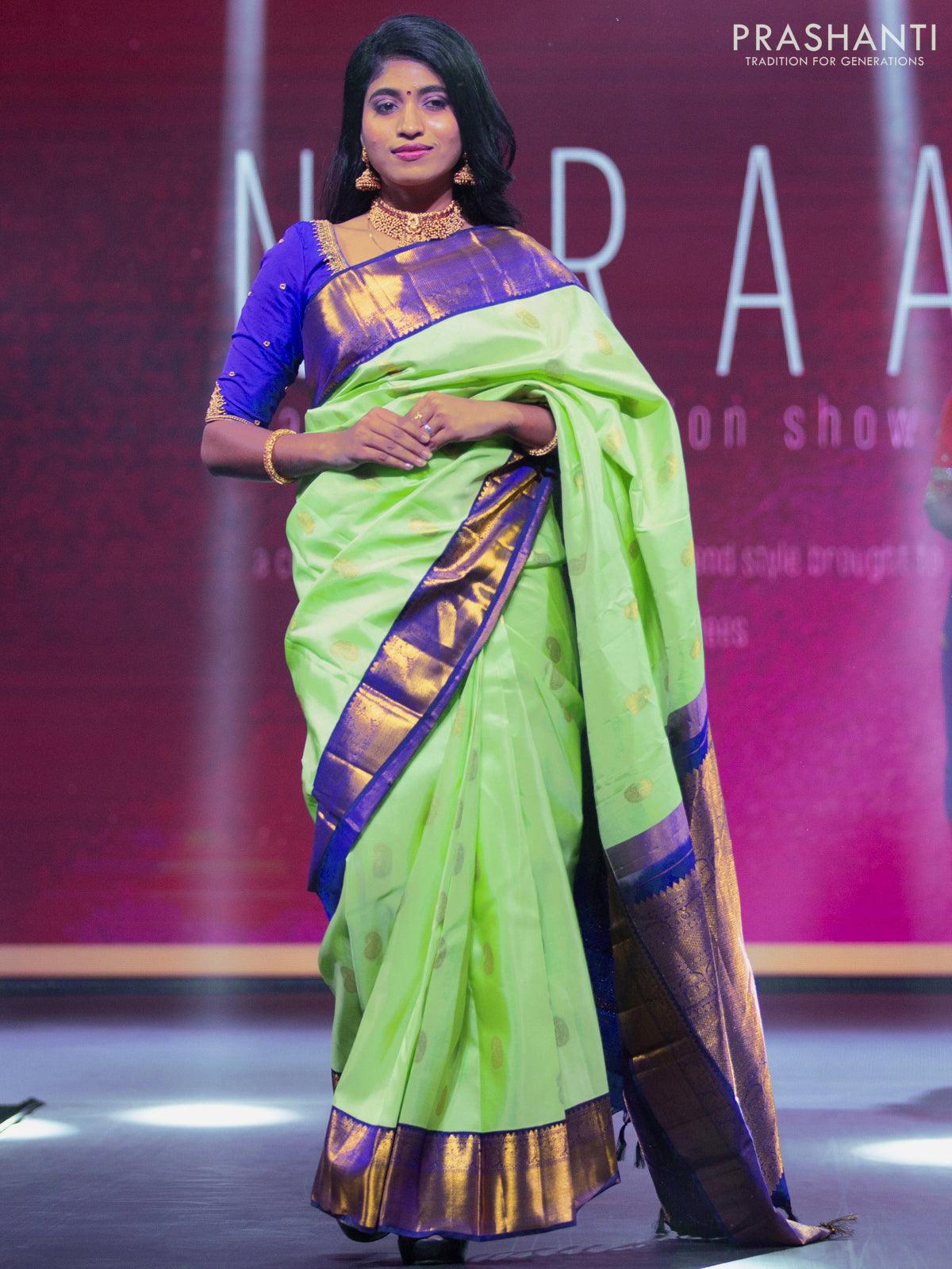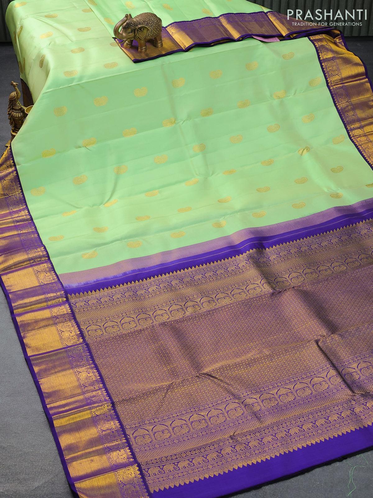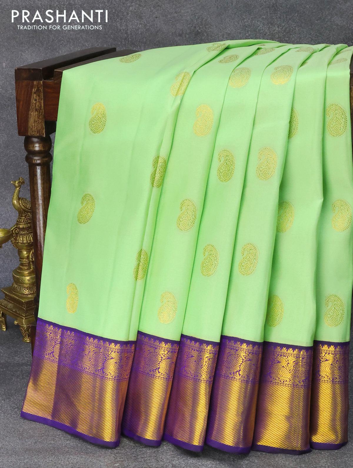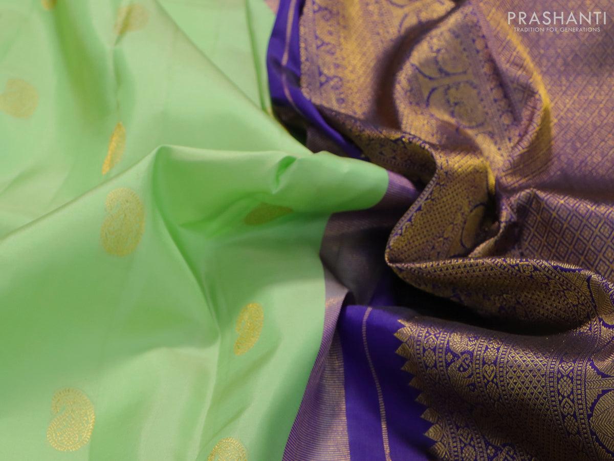 Niraa-2 Pure kanjivaram silk saree pista green and navy blue with allover zari woven paisley buttas and rich annam zari woven korvai border
