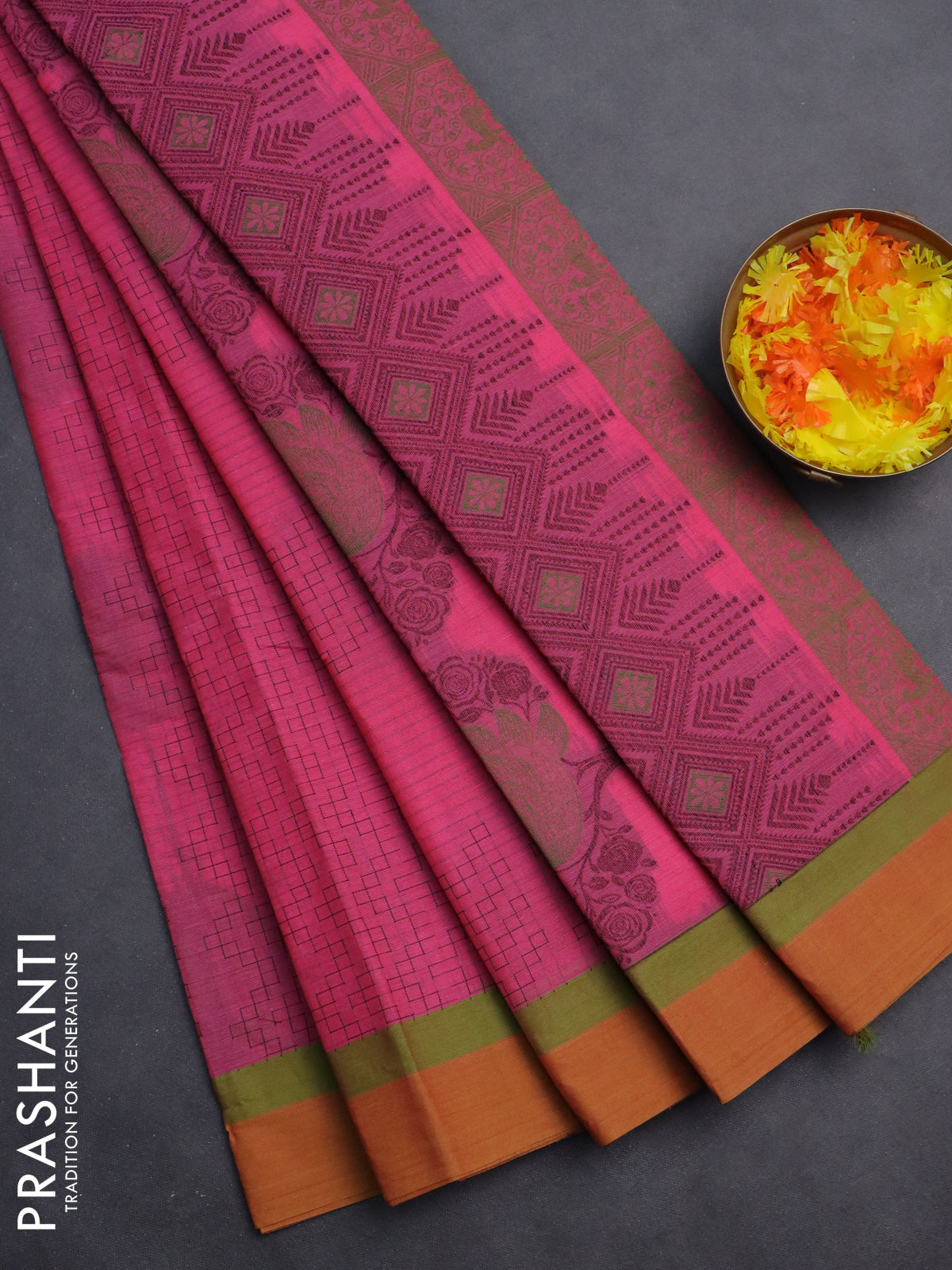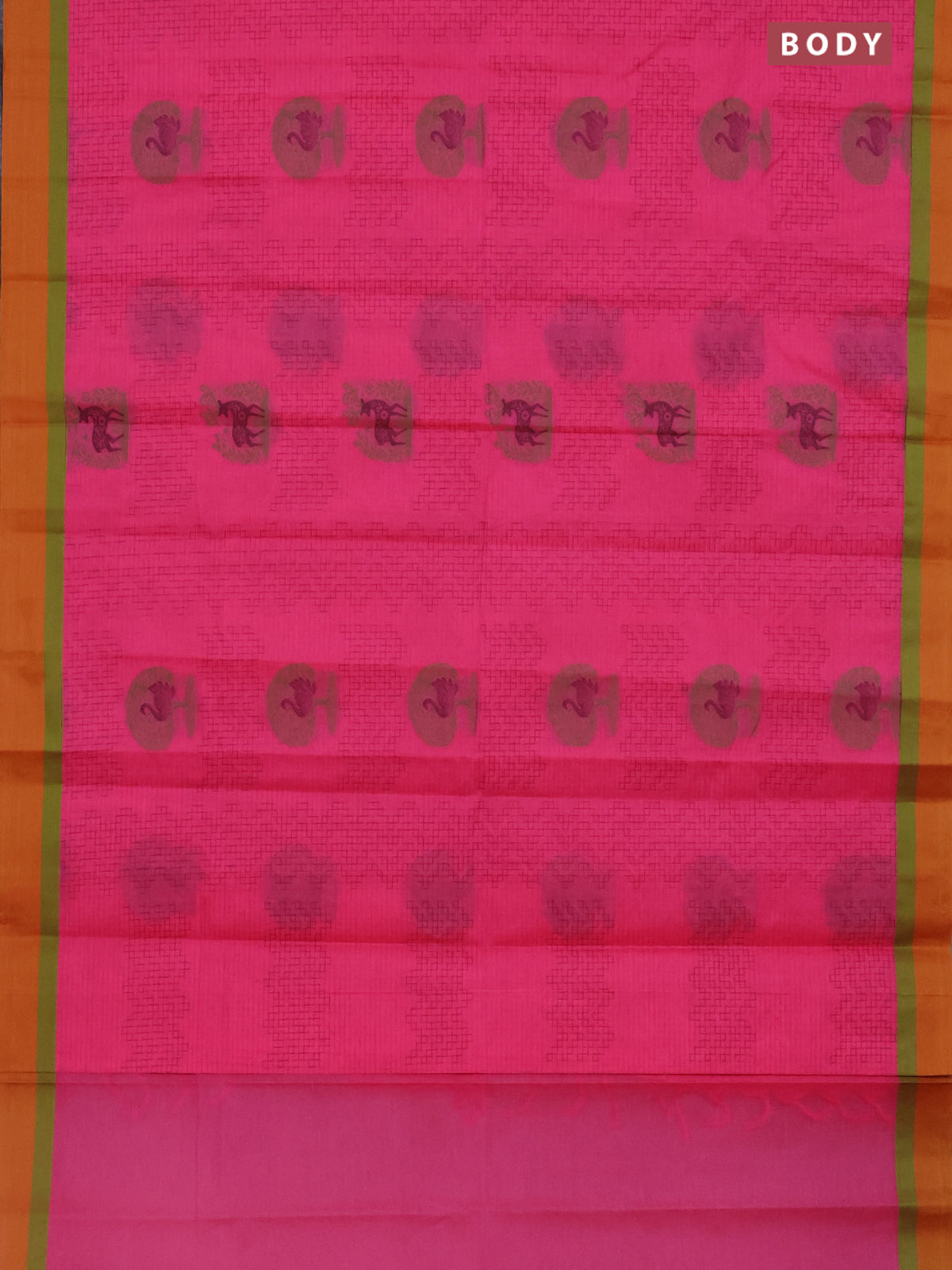 Nithyam cotton saree pink and mustard yellow with allover thread weaves and simple border