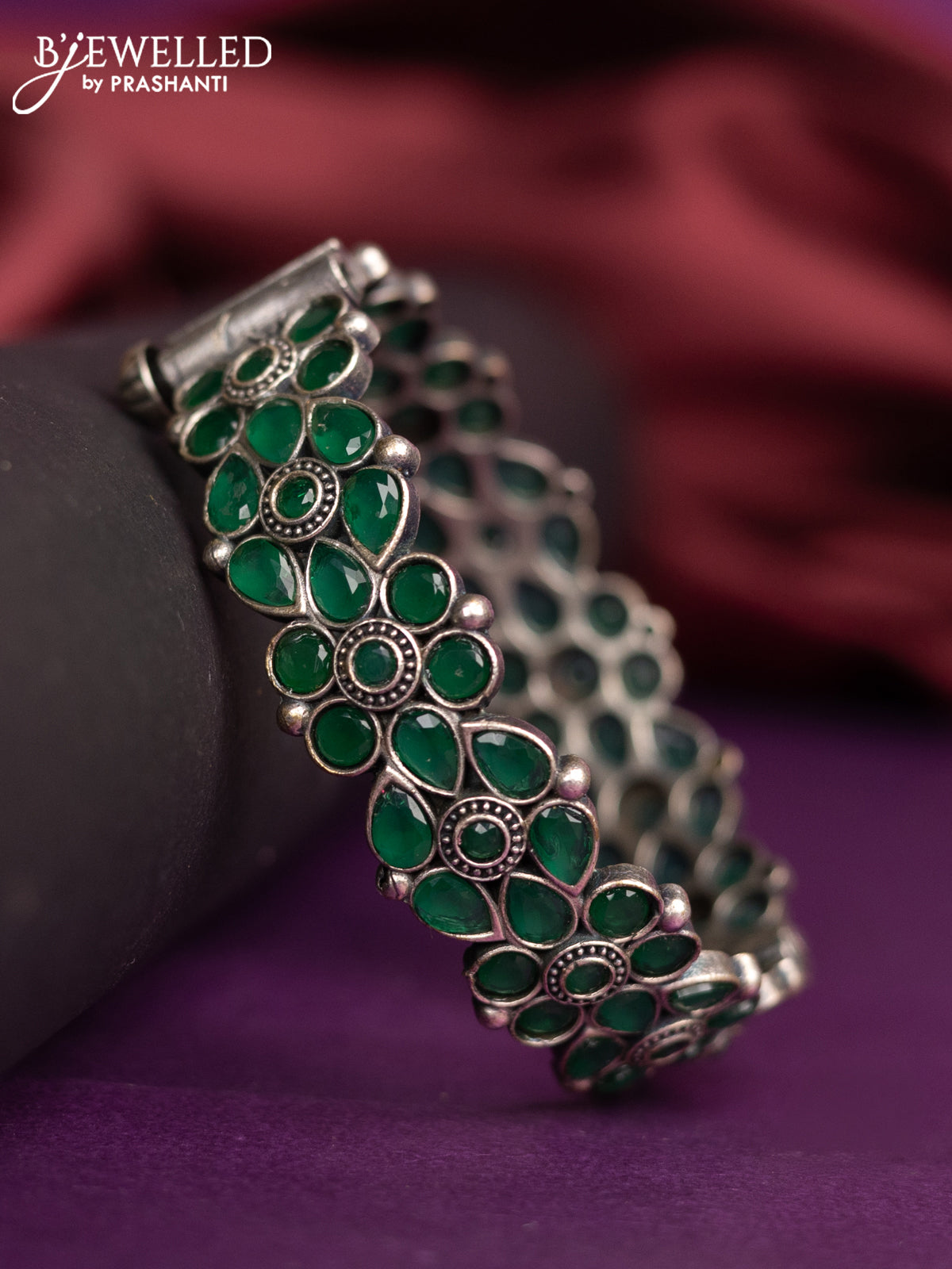 Oxidised floral design screw type bangle with emerald stones