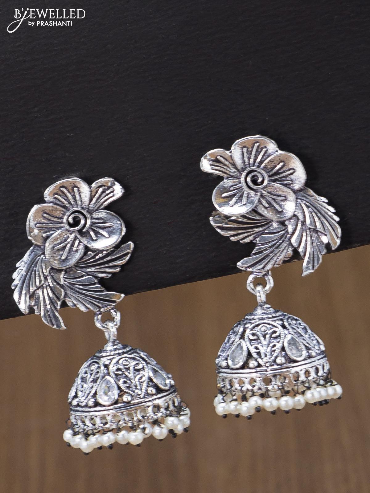 Oxidised jhumka floral & leaf design with cz stones and pearl hangings