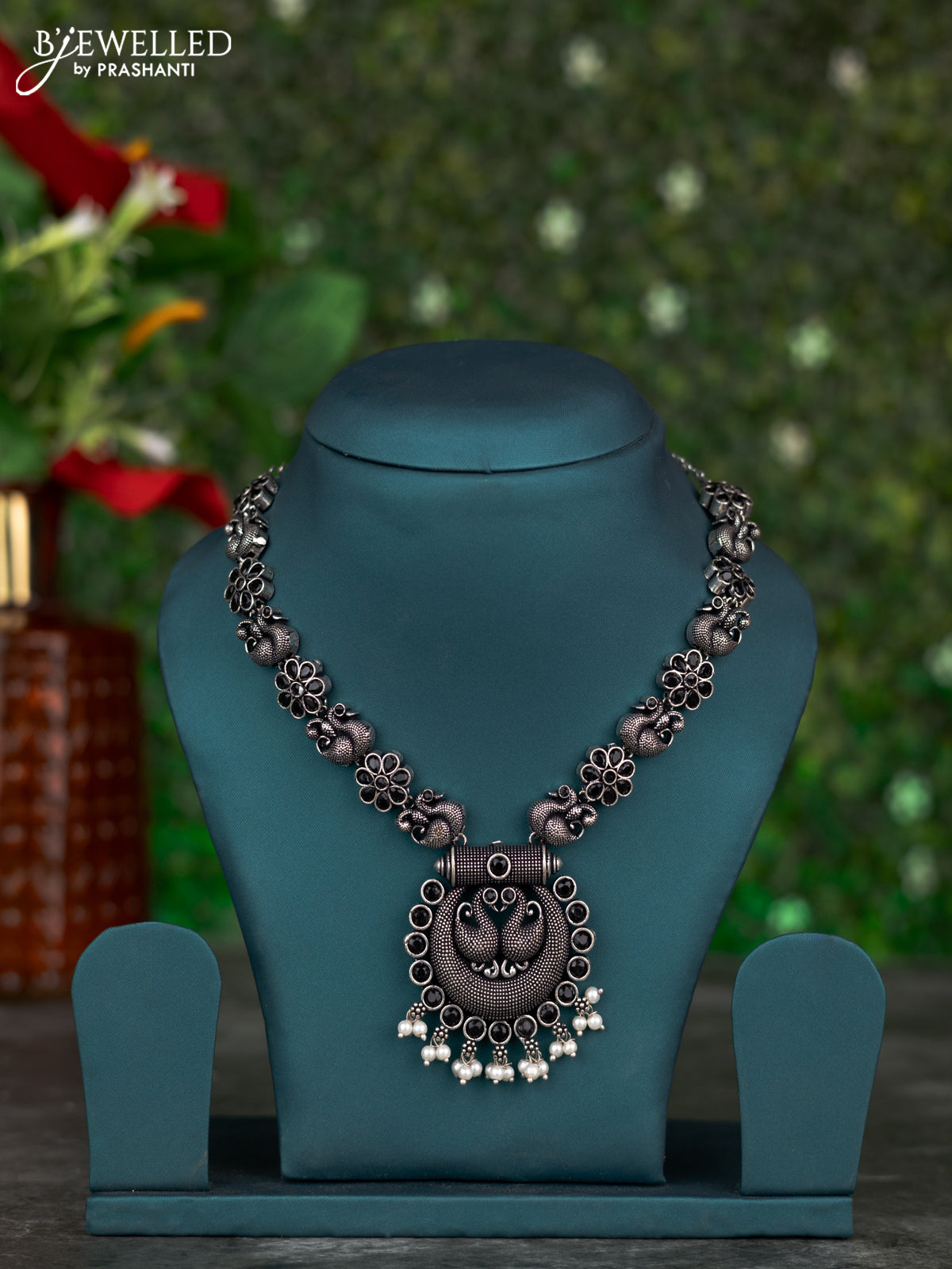 Oxidised necklace swan design with black stones and pearl hangings without earring