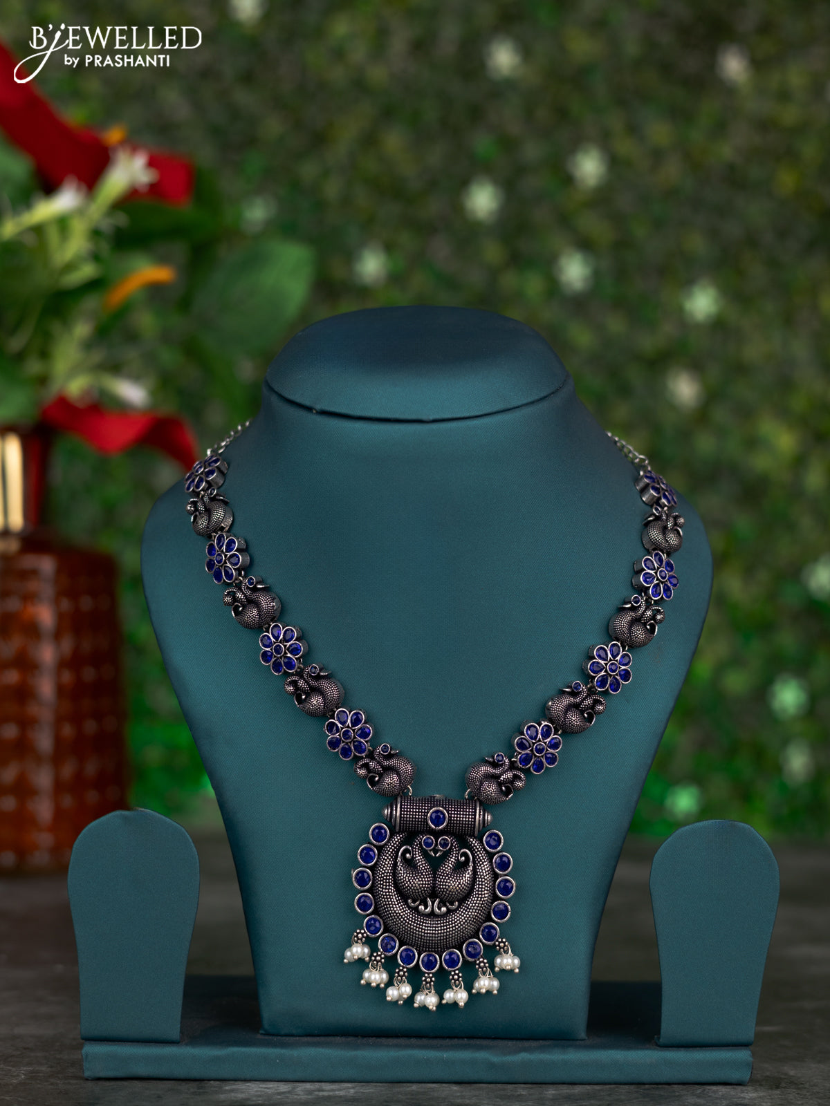 Oxidised necklace swan design with sapphire stones and pearl hangings without earring