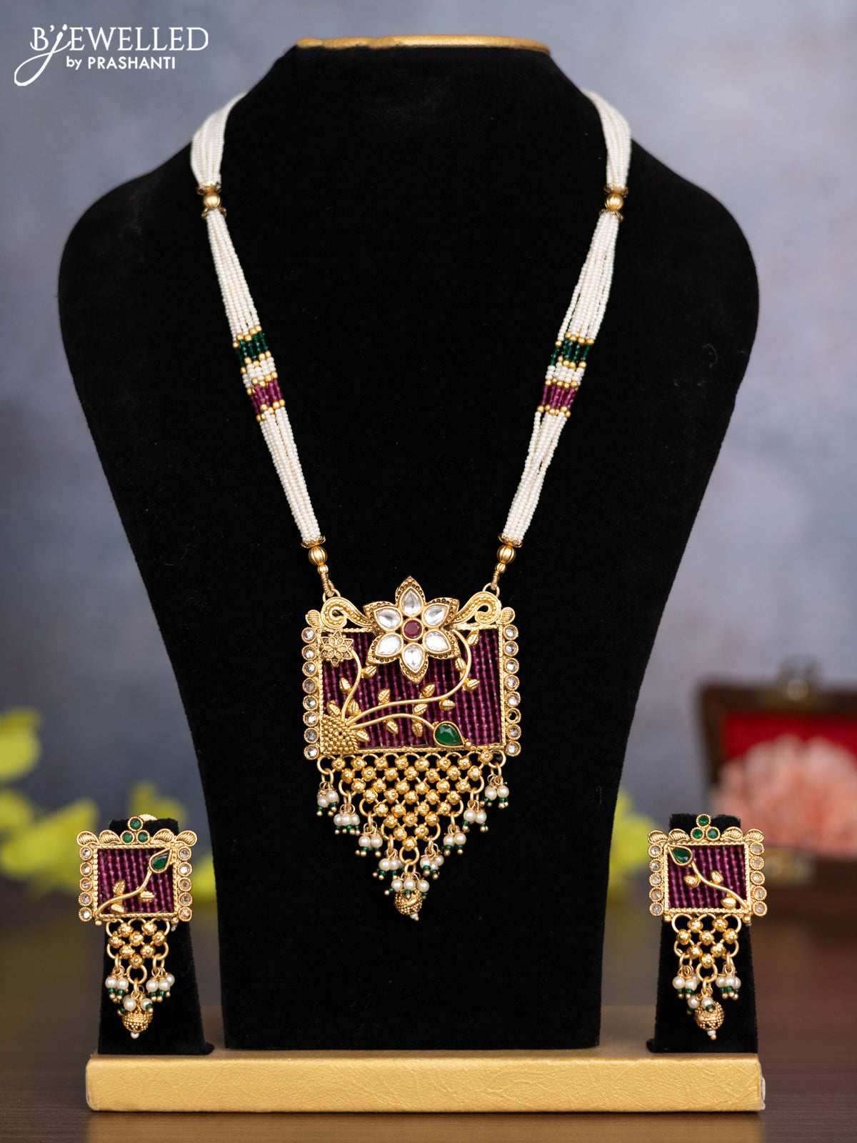 Pearl necklace floral design with kemp & kundan stones and pearl & golden beads hanging