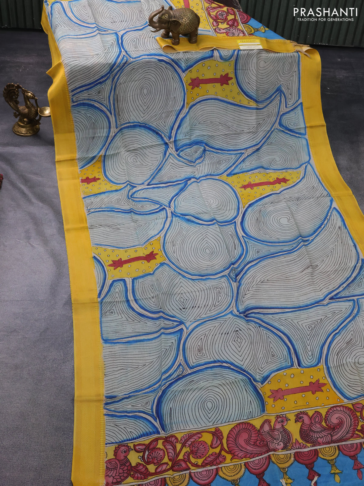Pen kalamkari dupatta beige blue and mustard yellow with allover kalamkari prints and zari woven border