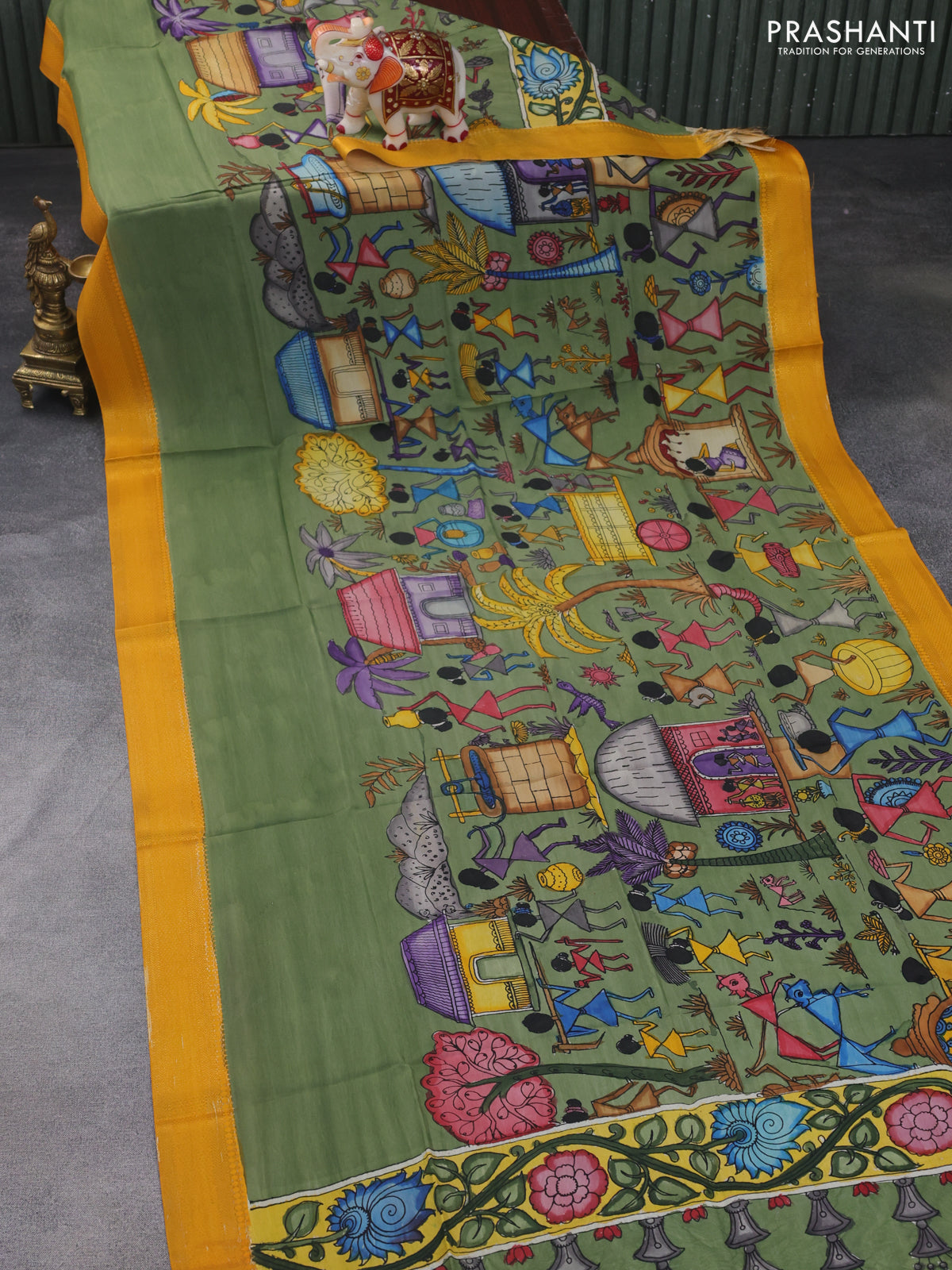 Pen kalamkari dupatta green and mustard yellow with allover kalamkari prints and zari woven border