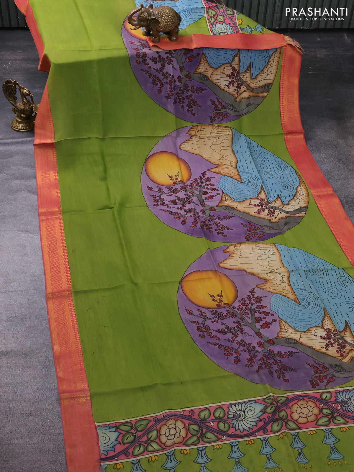 Pen kalamkari dupatta green and peach pink shade with allover kalamkari prints and zari woven border