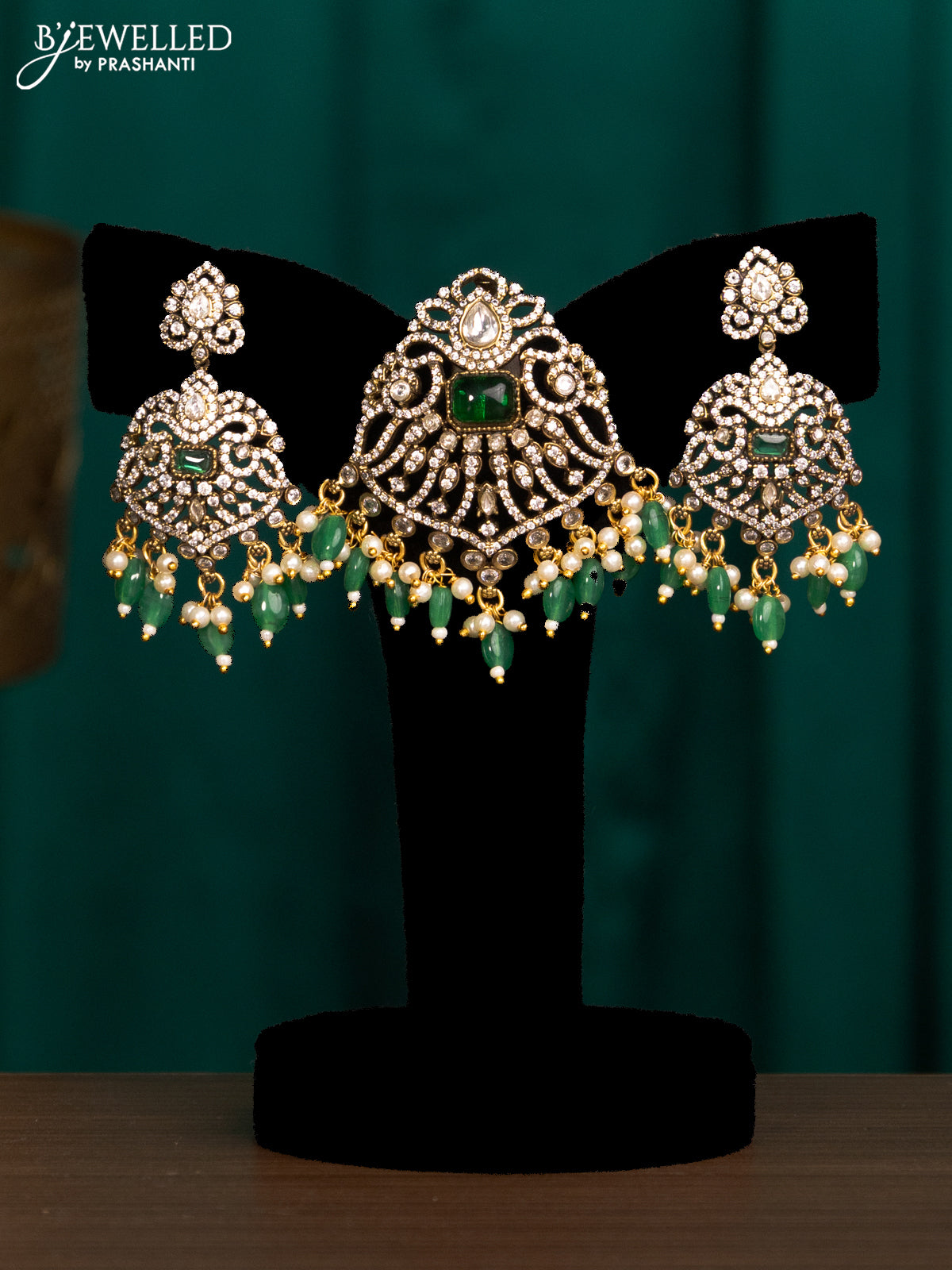 Pendant set with emerald & cz stones and beads hanging in victorian finish