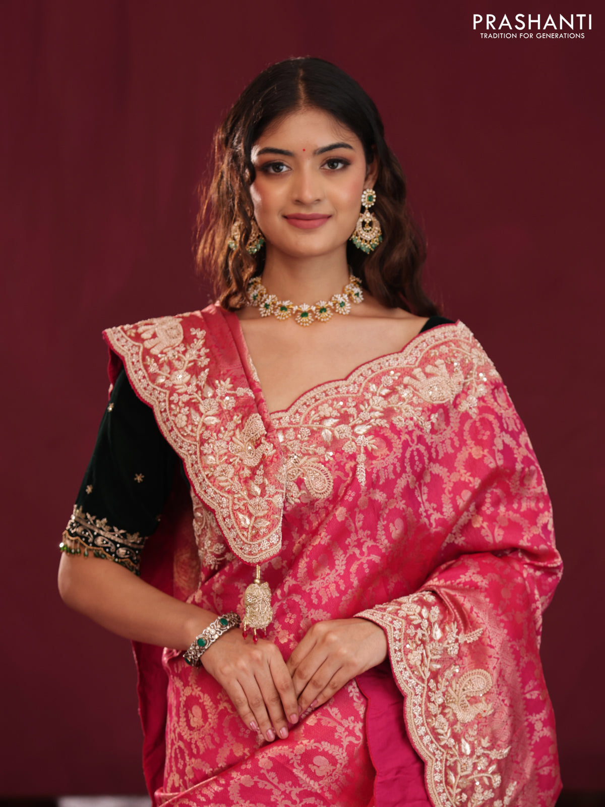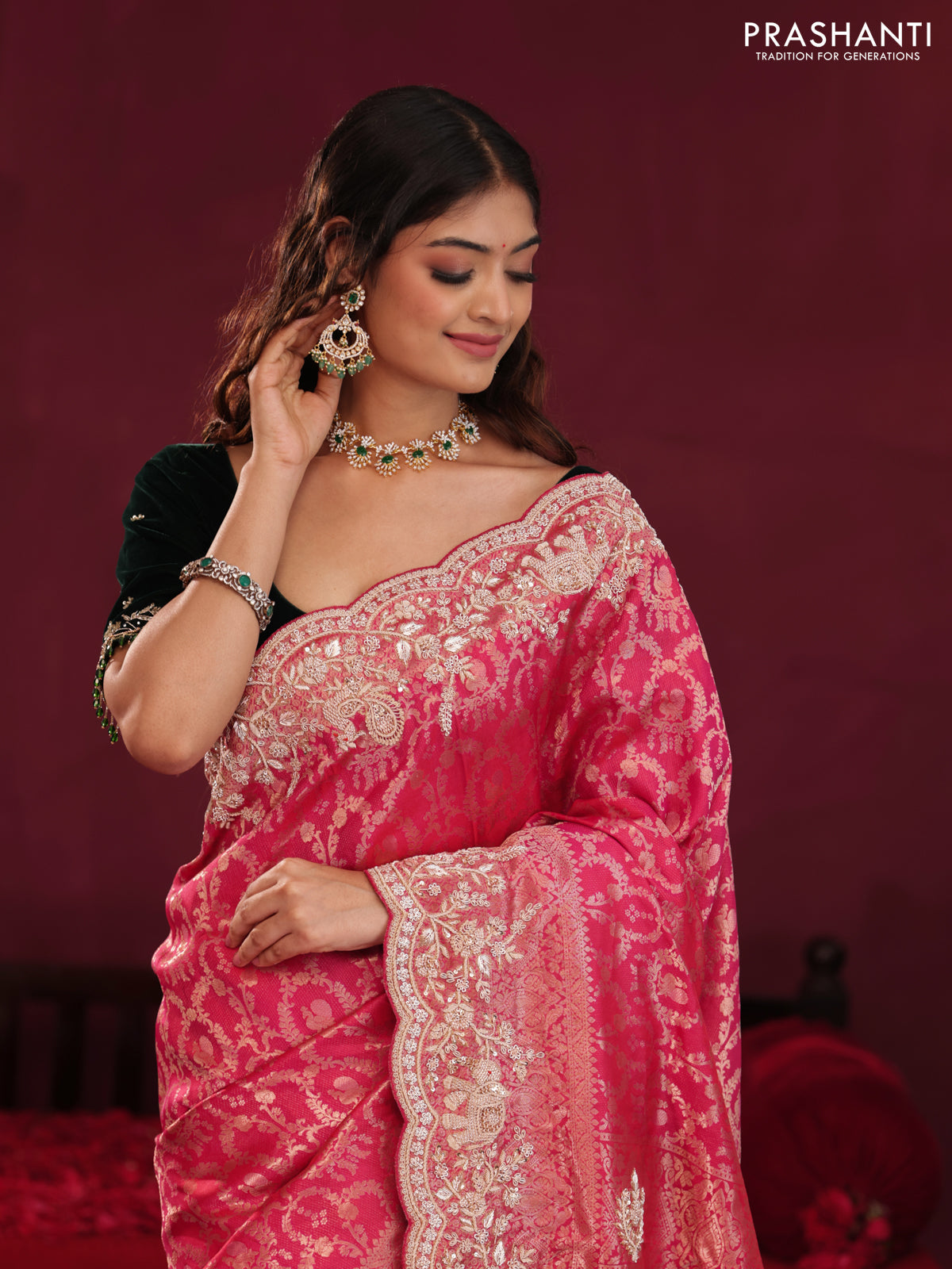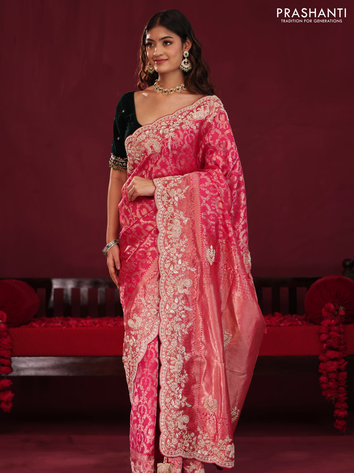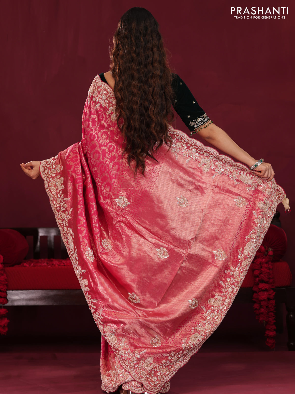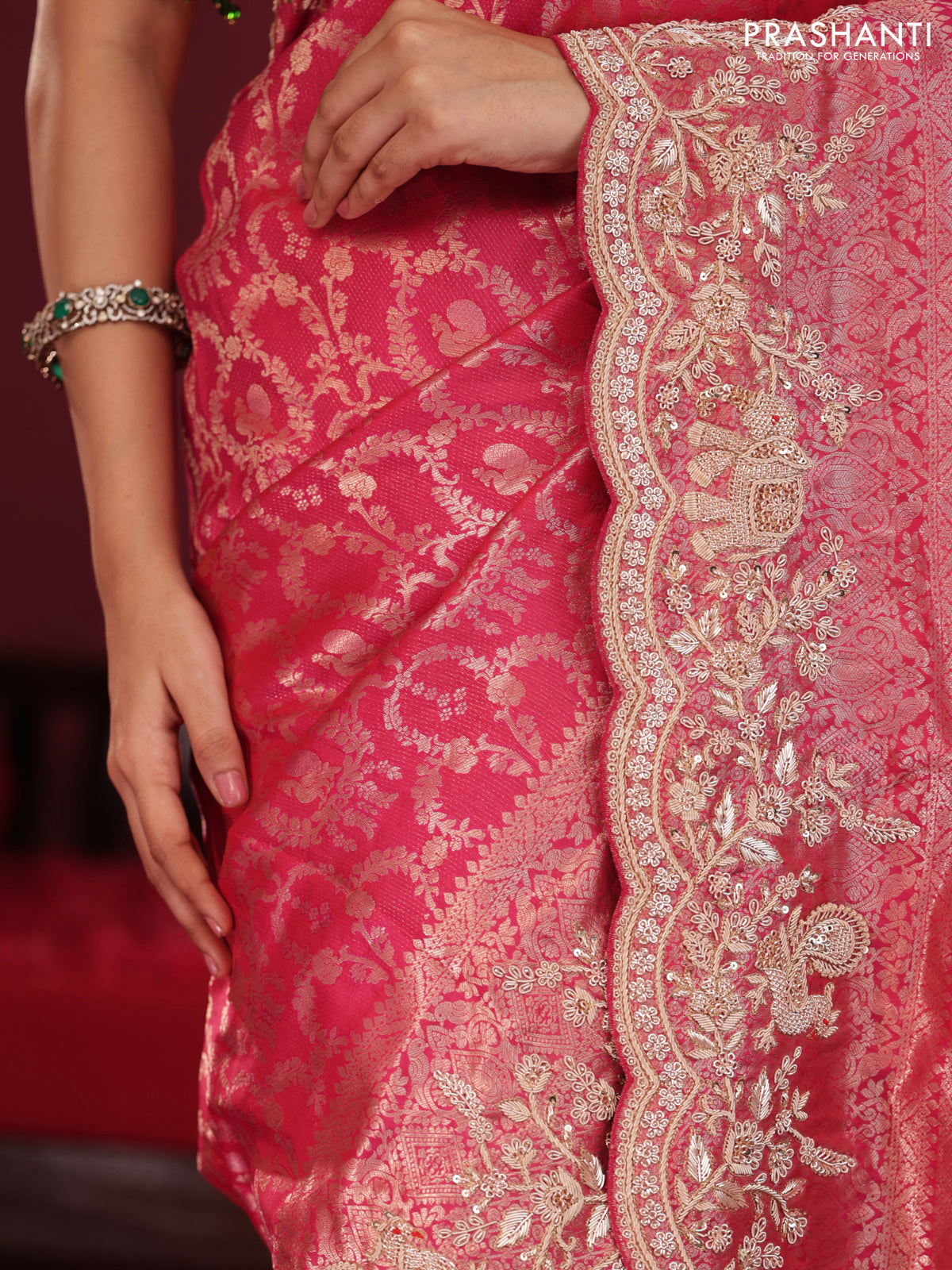 Pink Pure kanchipuram silk saree with allover brocade zari weaves & border embroidery