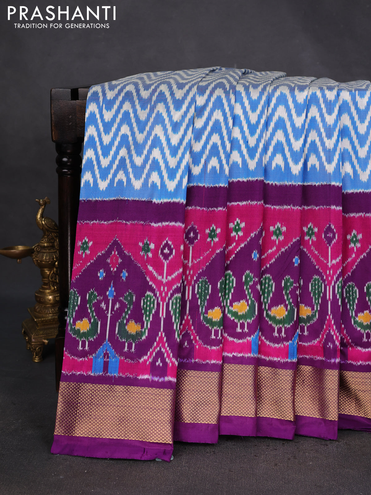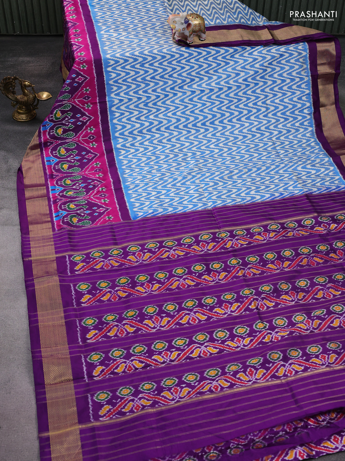 Pochampally silk saree blue off white and purple with allover zig zag ikat weaves and long ikat woven zari border
