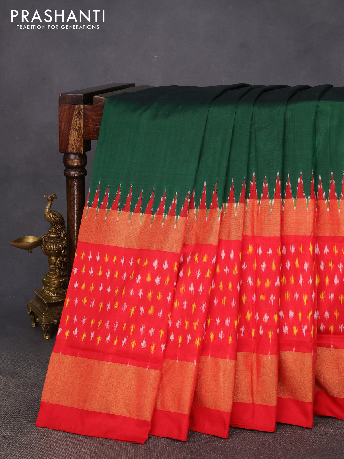 Pochampally silk saree dark green and red with plain body and temple design zari woven ikat style border