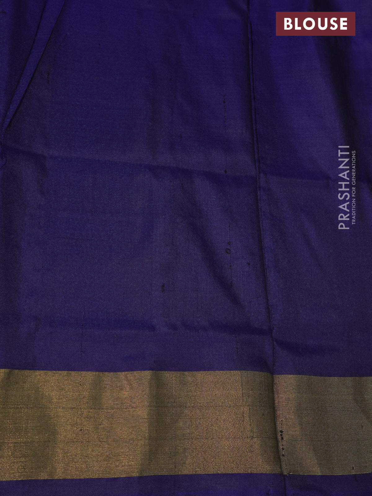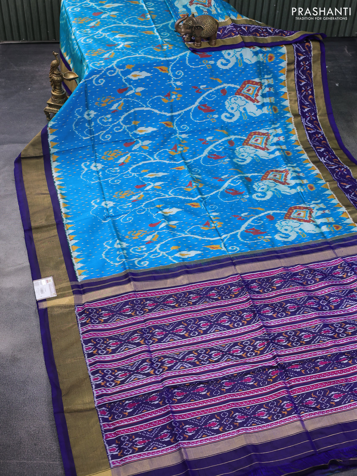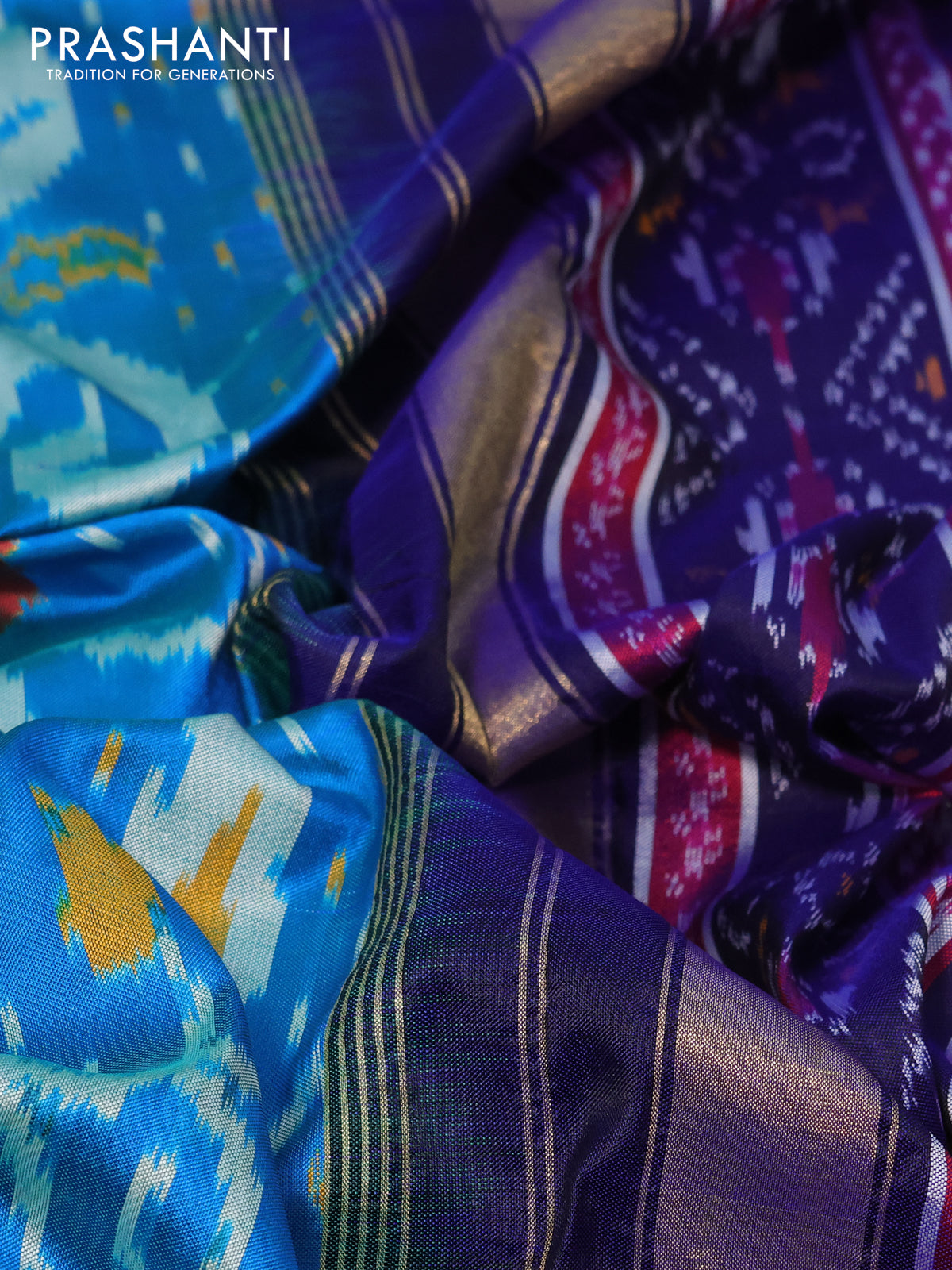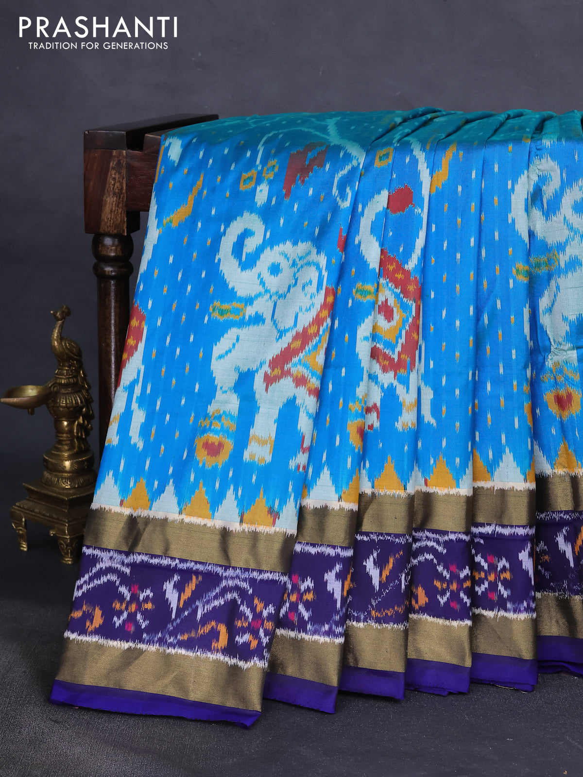 Pochampally silk saree dual shade of cs blue and blue with allover ikat weaves and temple design ikat woven border