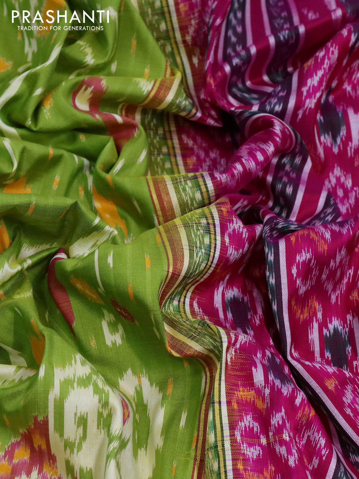 Pochampally silk saree light green and pink with allover patola weaves and zari woven ikat border