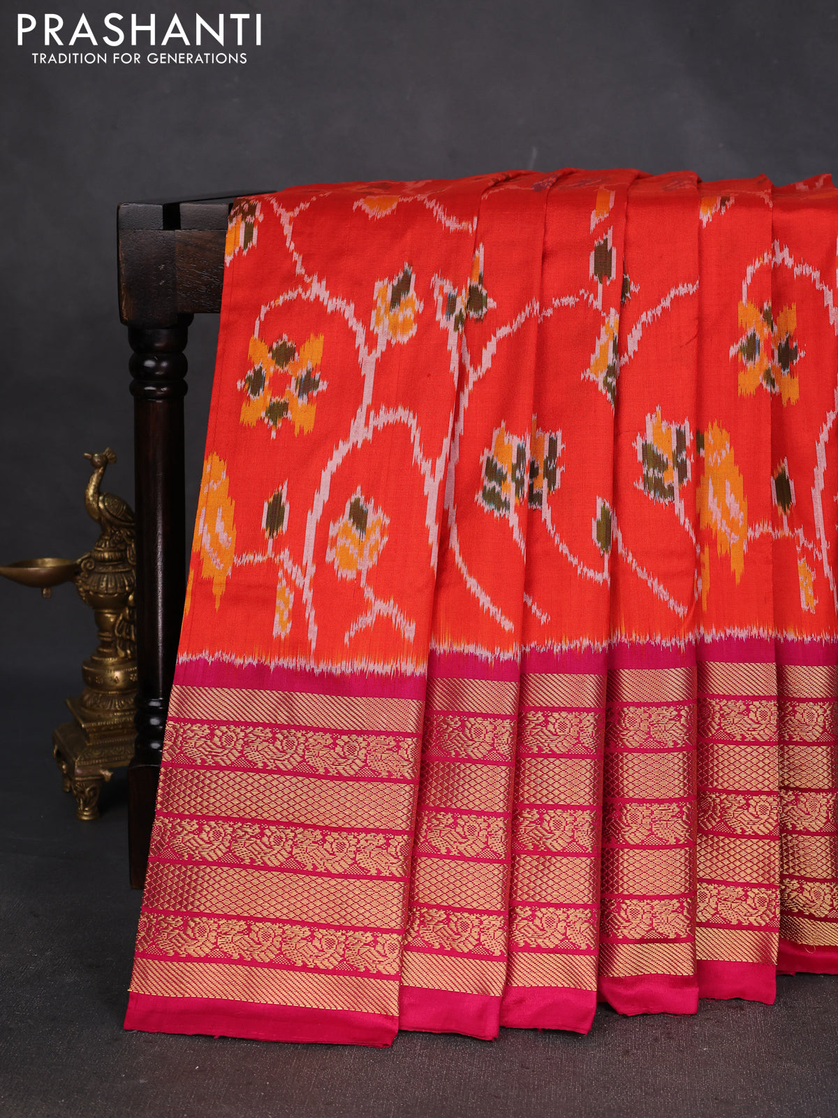 Pochampally silk saree orange and pink with allover ikat weaves and long zari woven border