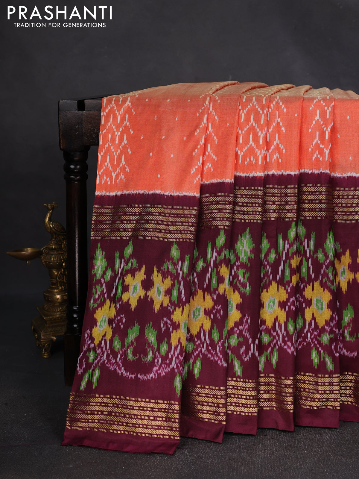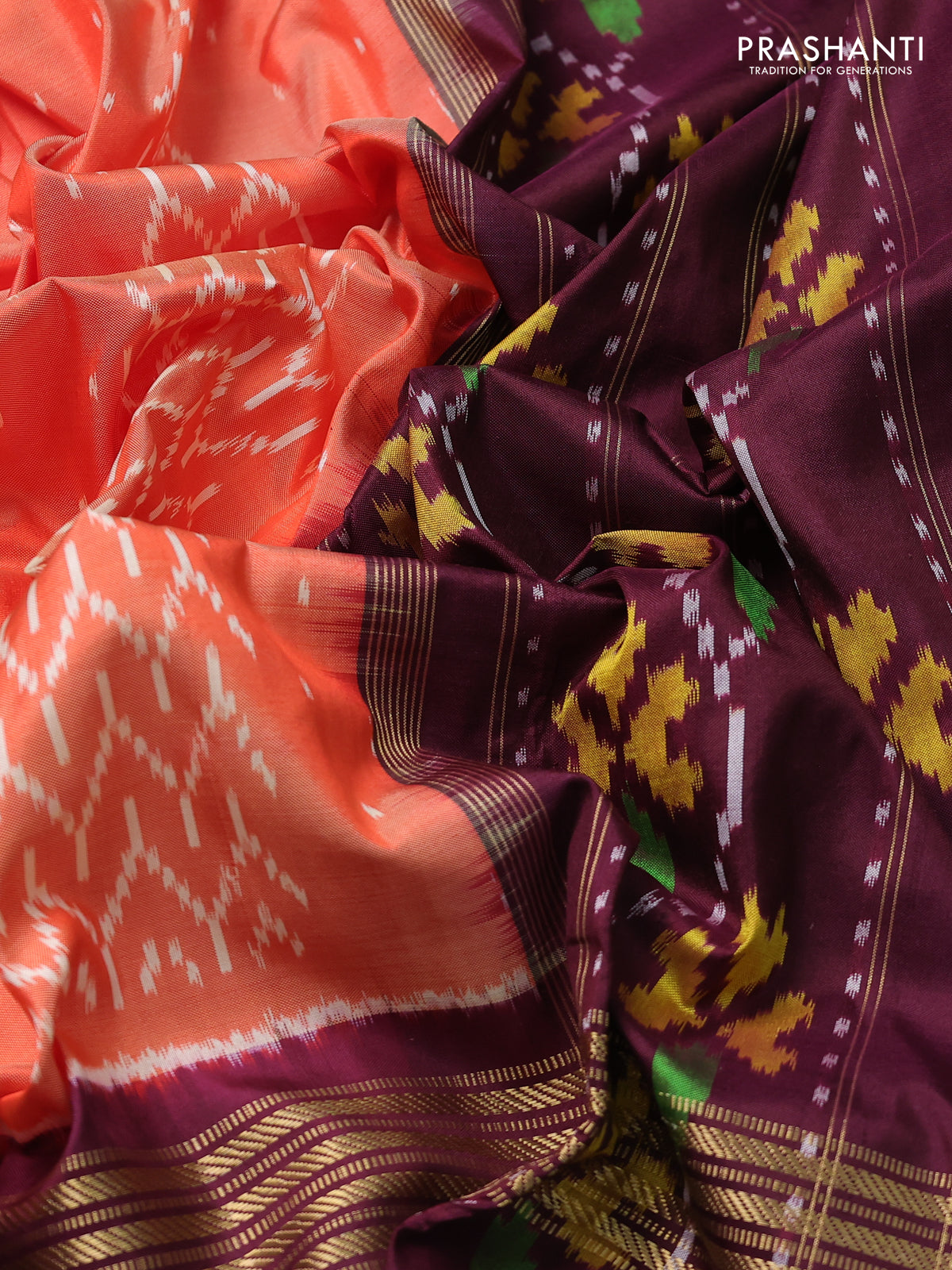 Pochampally silk saree orange and wine shade with allover ikat weaves and long zari woven ikat border