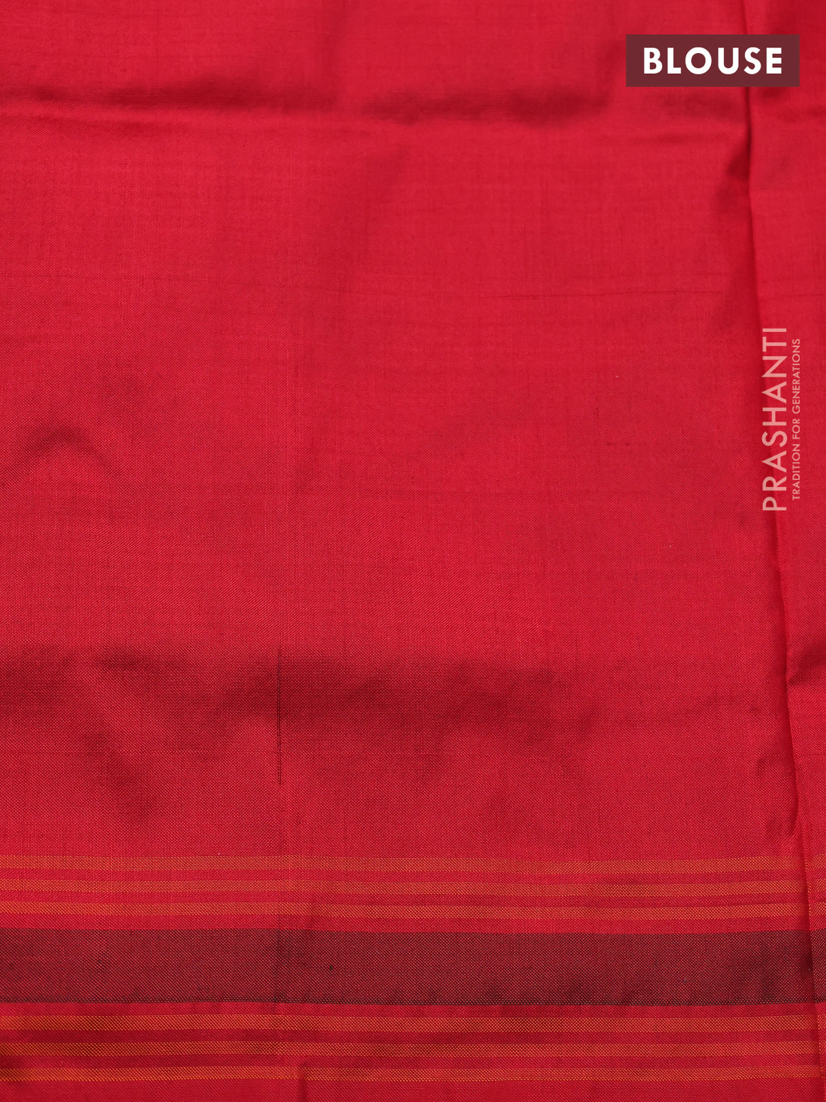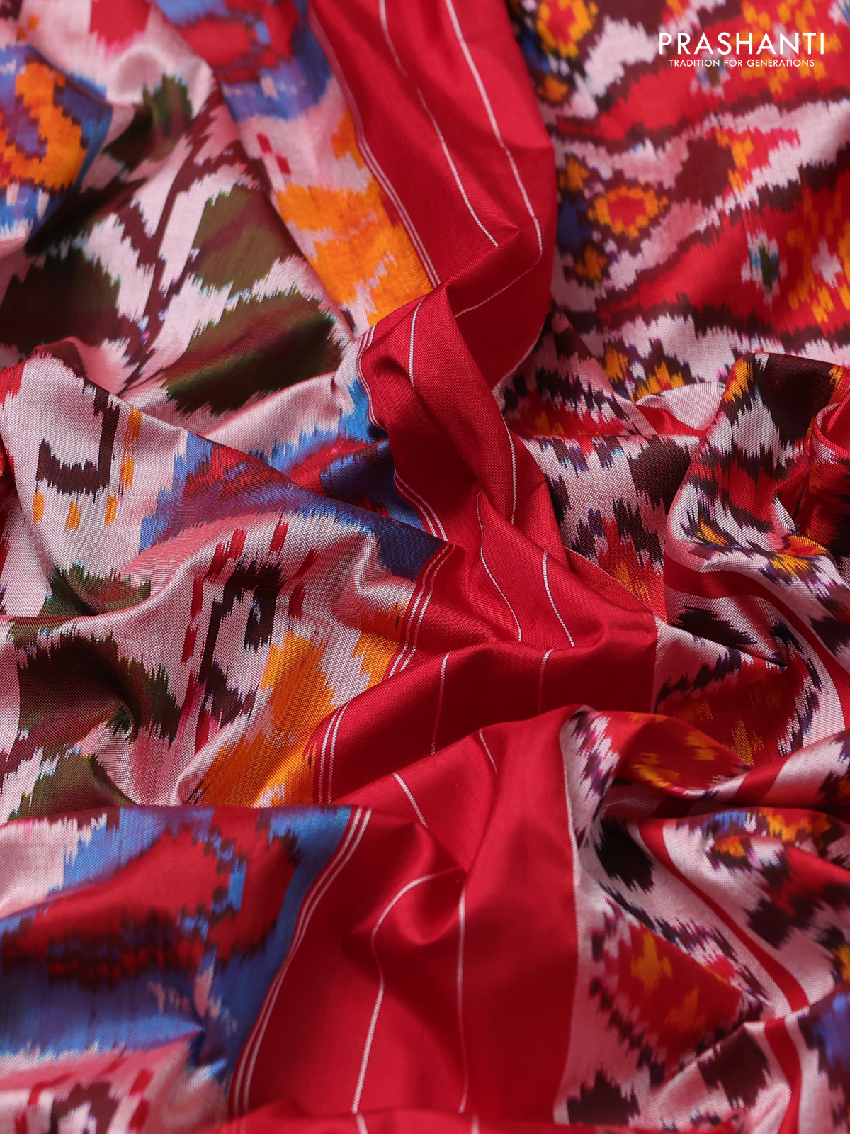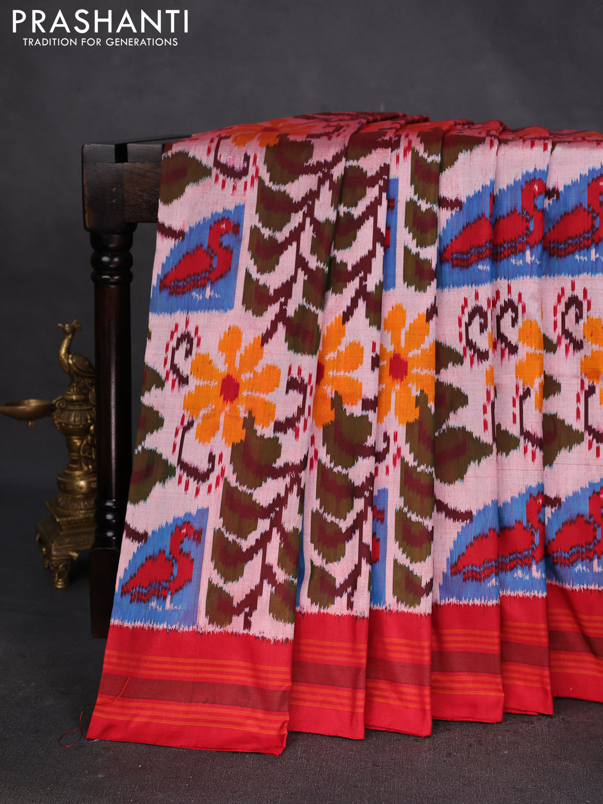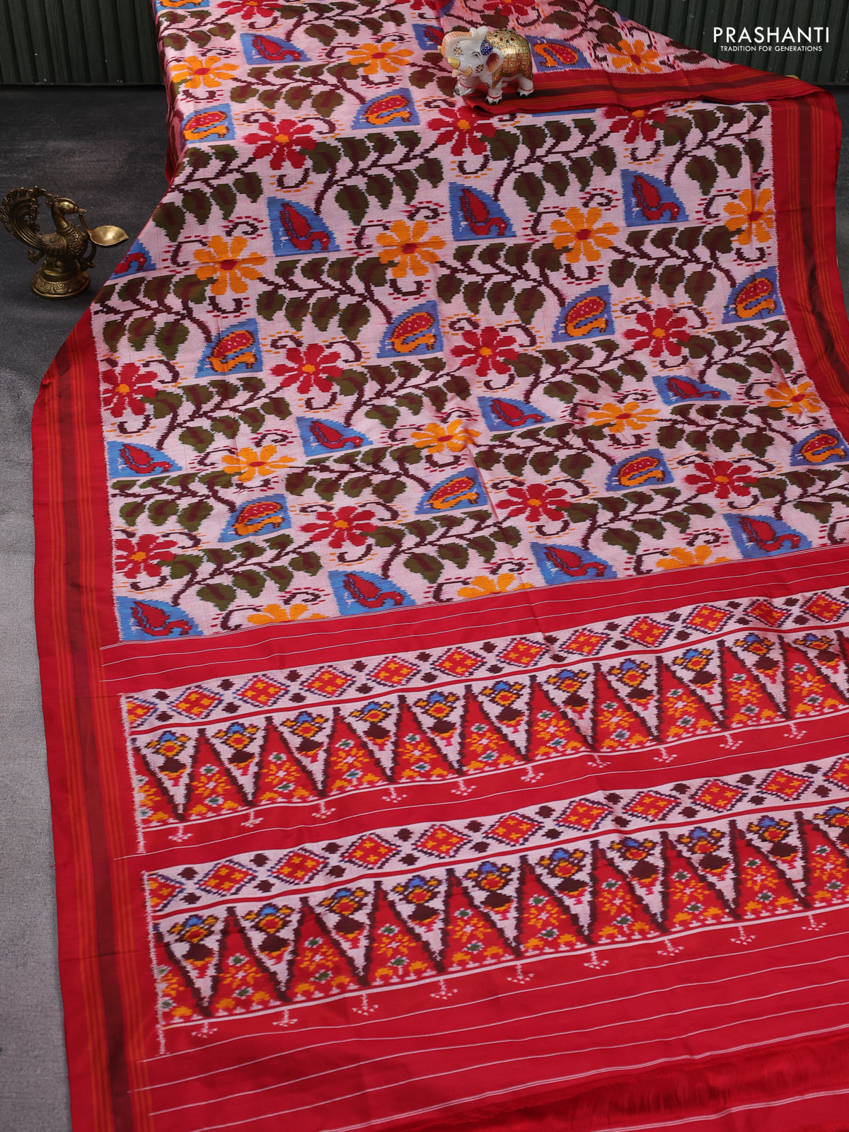 Pochampally silk saree peach shade and red with allover ikat weaves and rettapet border