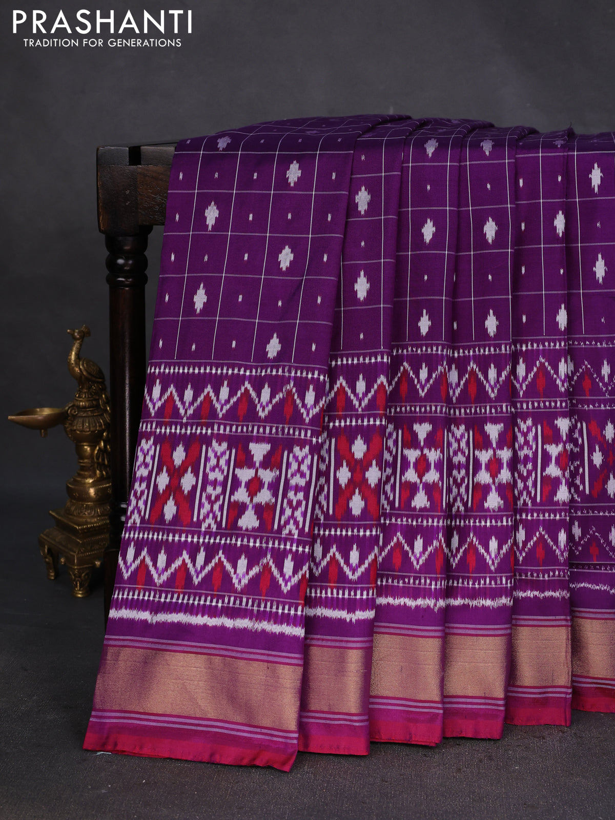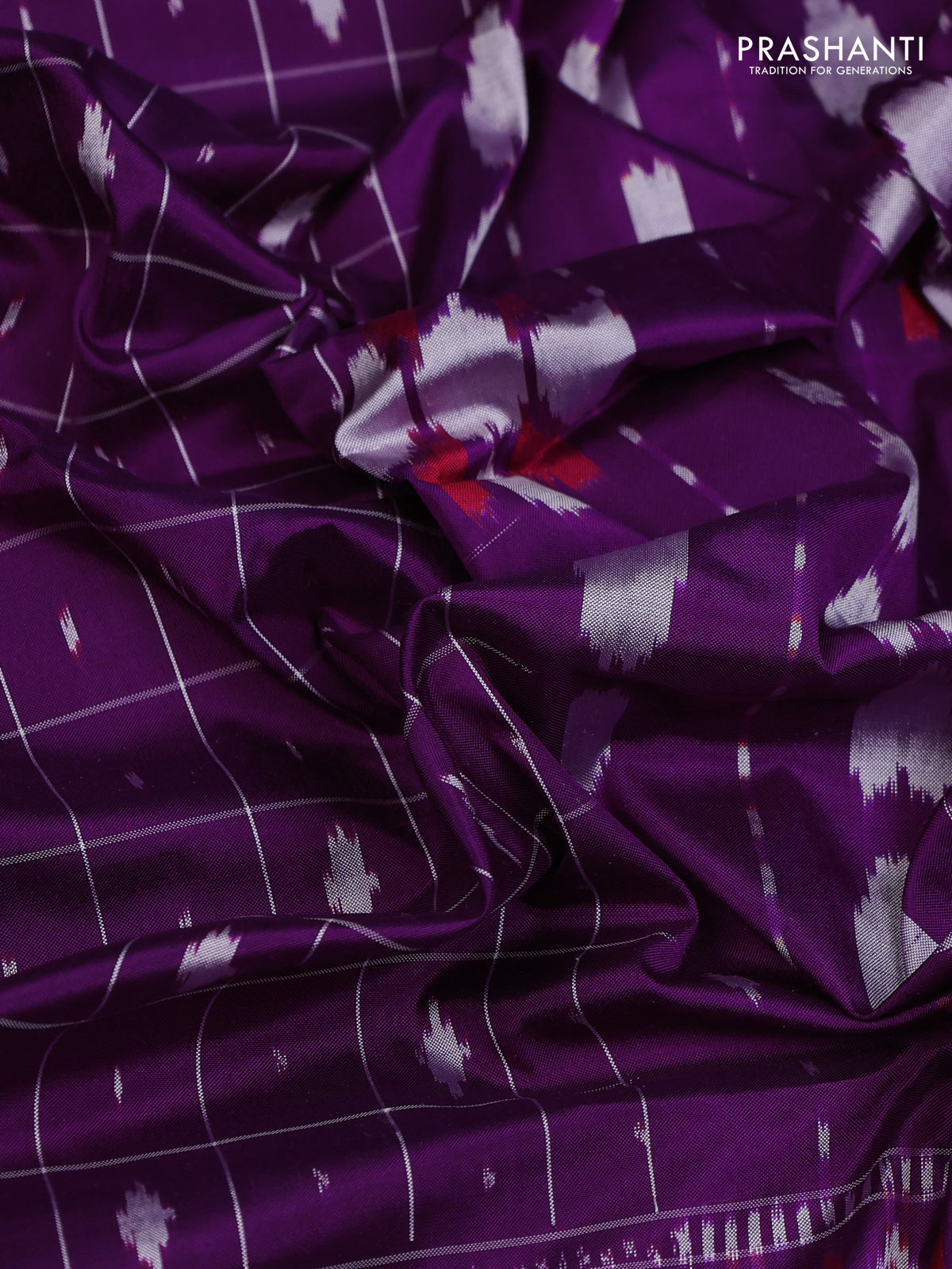 Pochampally silk saree purple and maroon with allover checks & ikat butta weaves and long ikat woven zari border