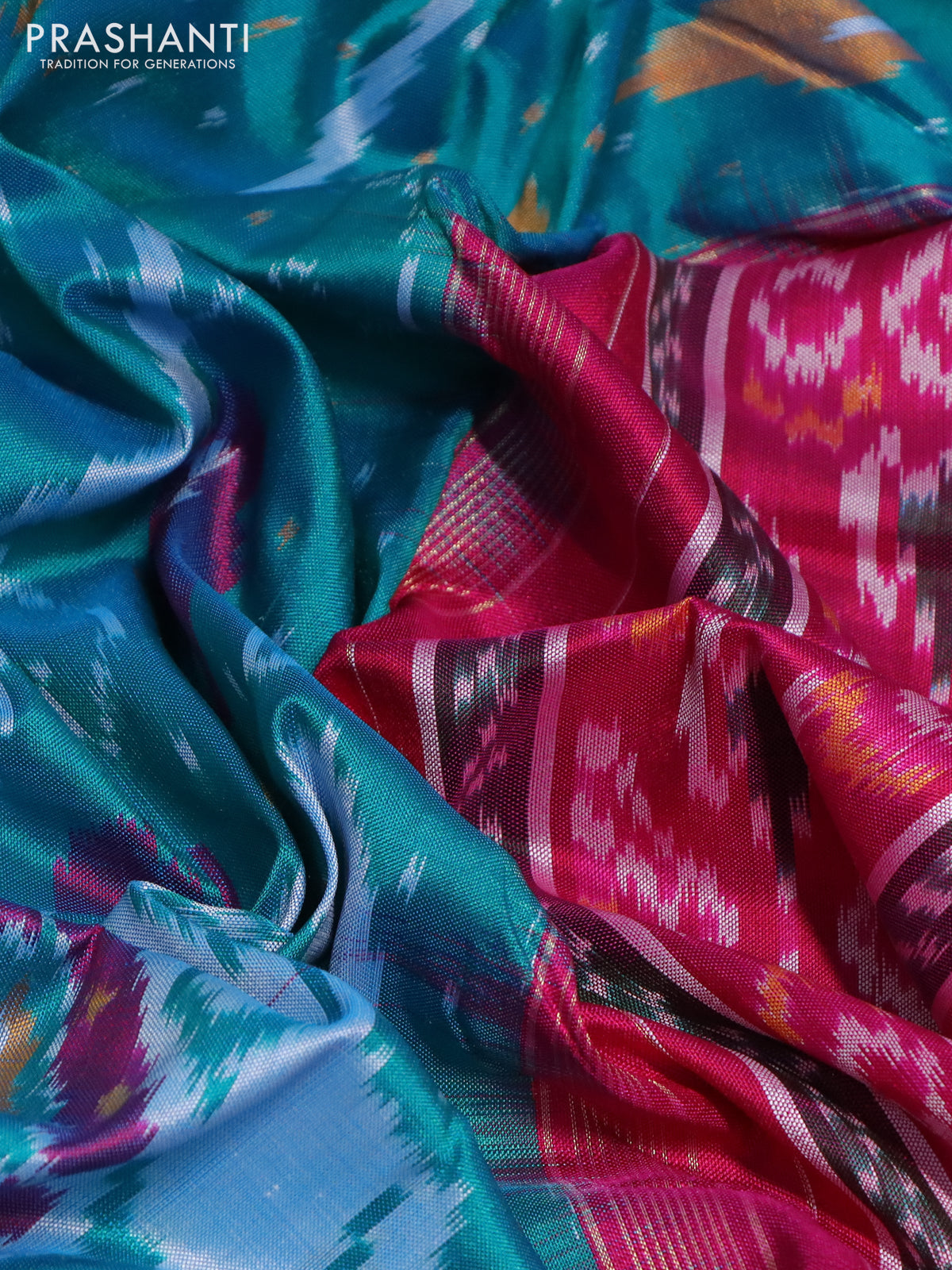 Pochampally silk saree teal bluish green and pink with allover ikat weaves and temple design zari woven ikat border