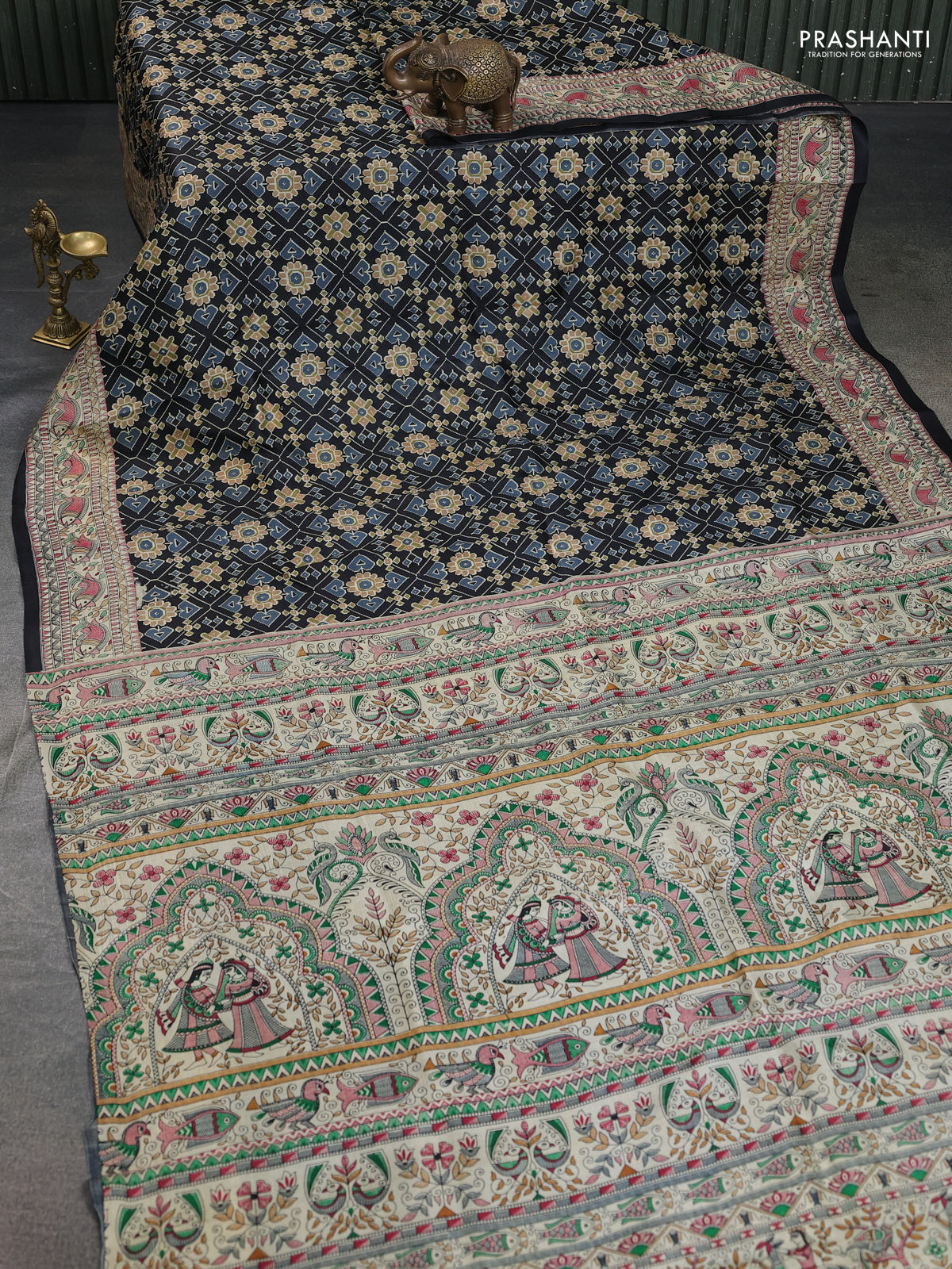 Printed silk saree black and cream with allover ikat prints and madhubani printed pallu & border