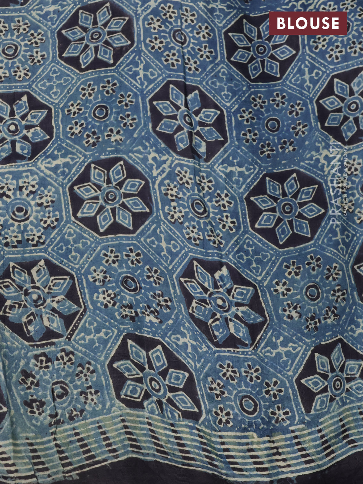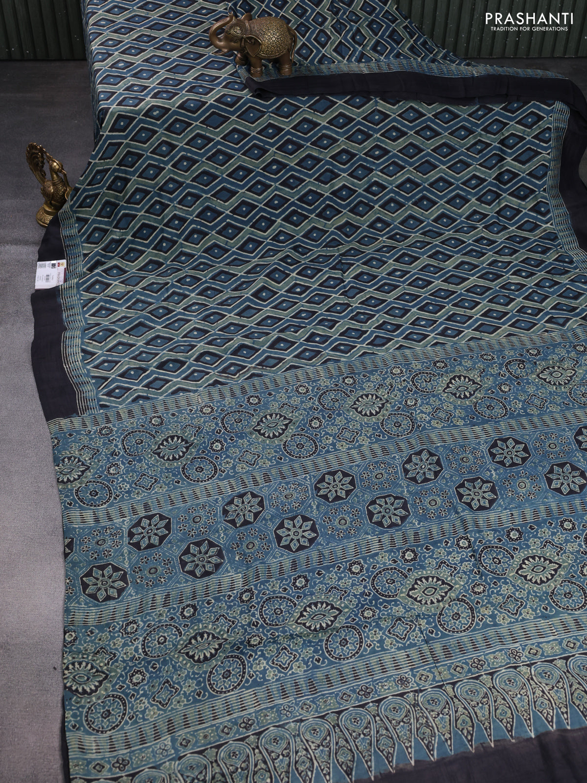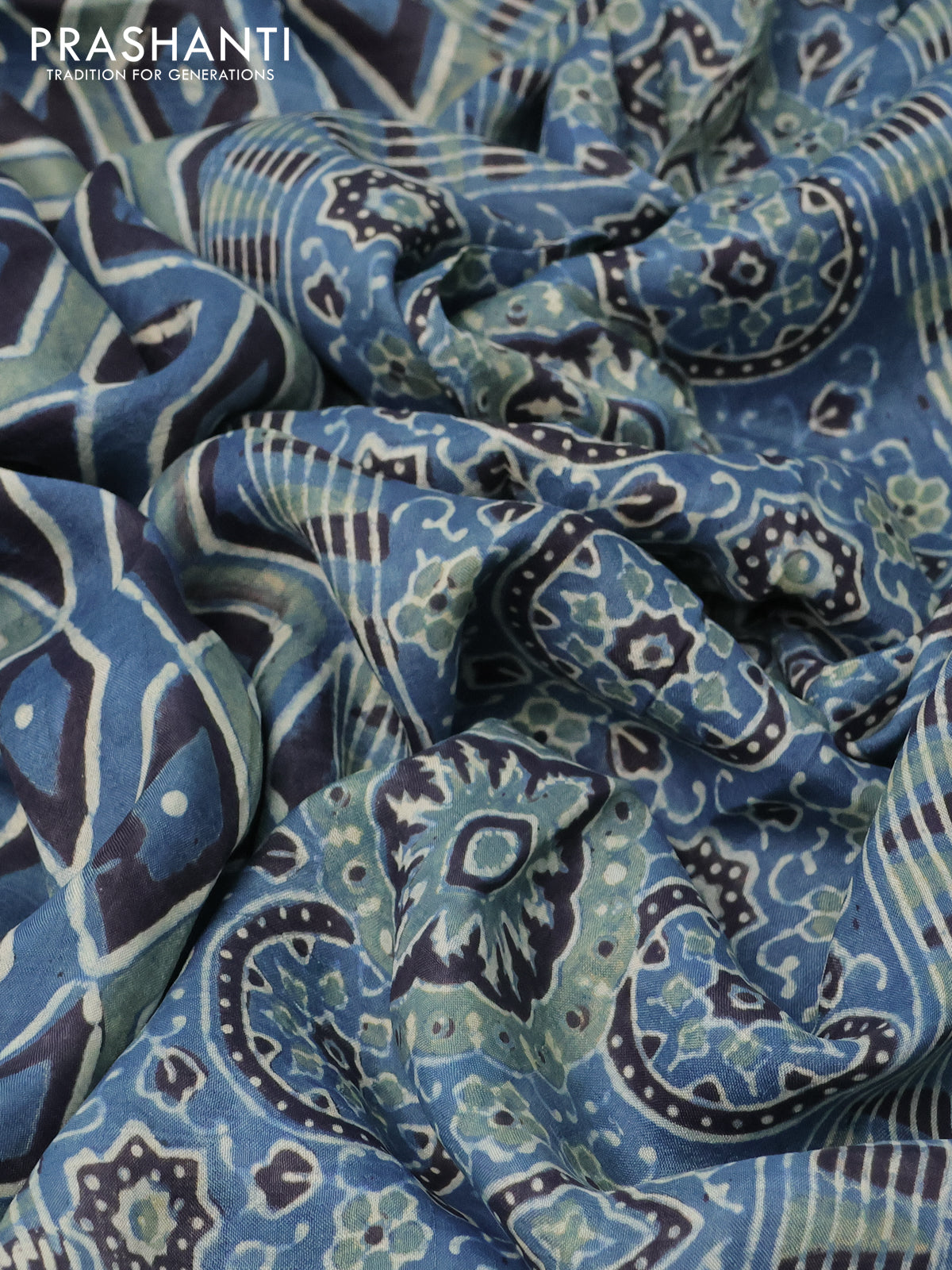 Printed silk saree blue and black with allover ajrakh prints and simple border