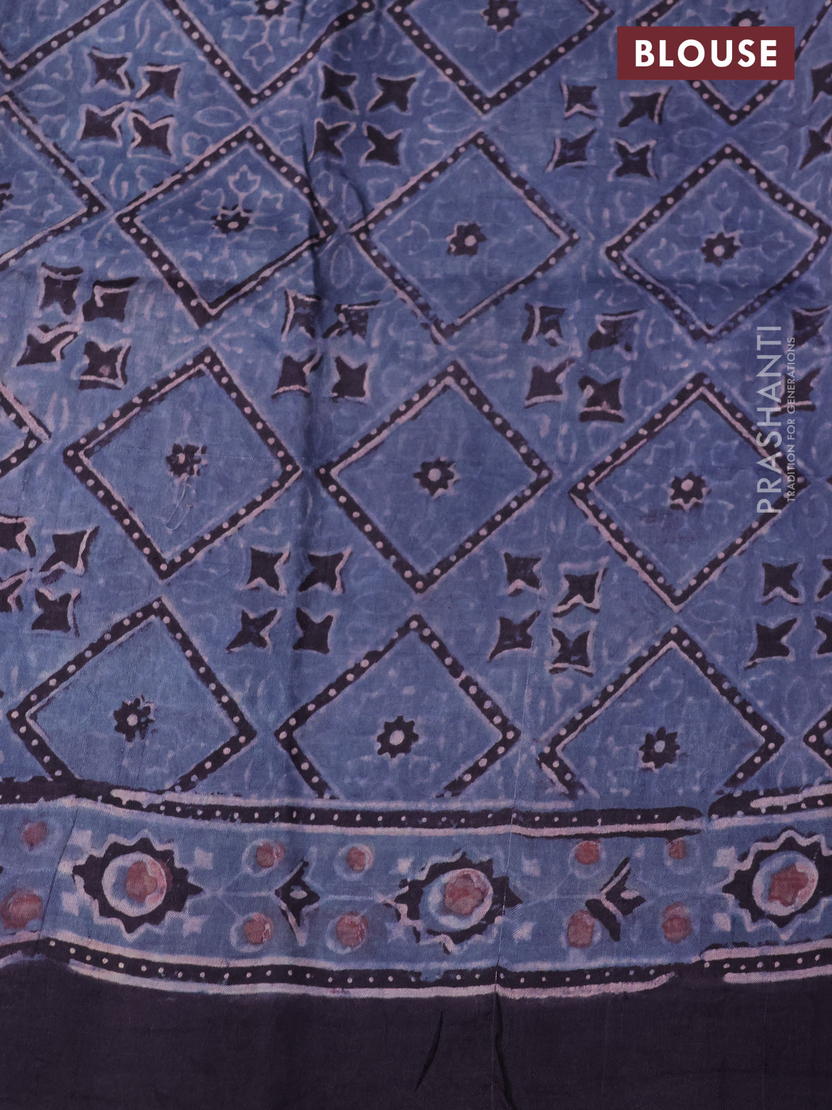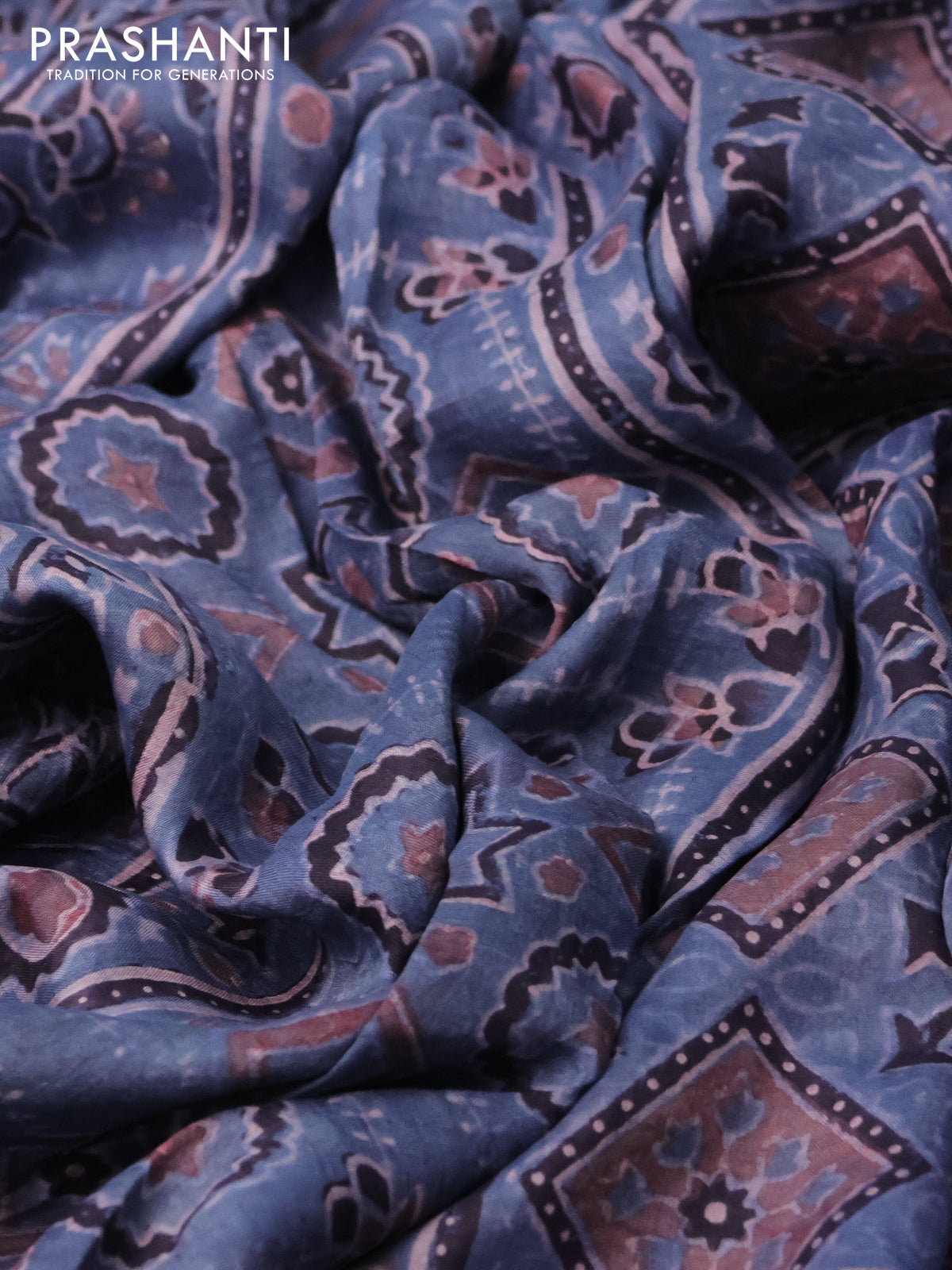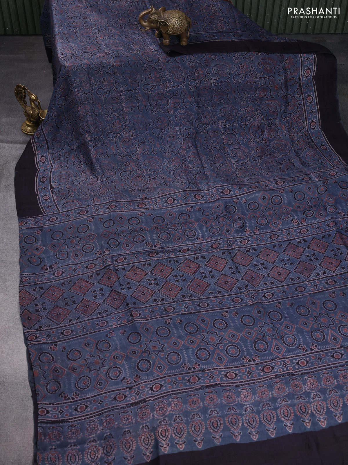 Printed silk saree bluish grey and deep jamun with allover ajrakh prints and simple border