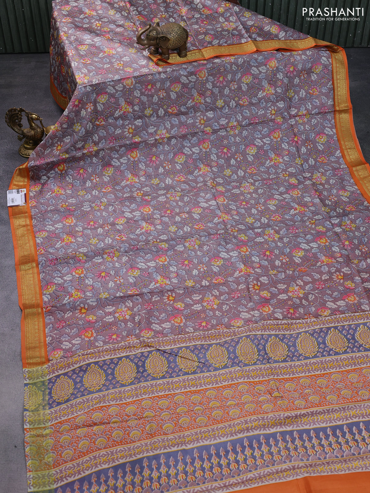 Printed silk saree grey shade and orange with allover kalamkari prints and zari woven border