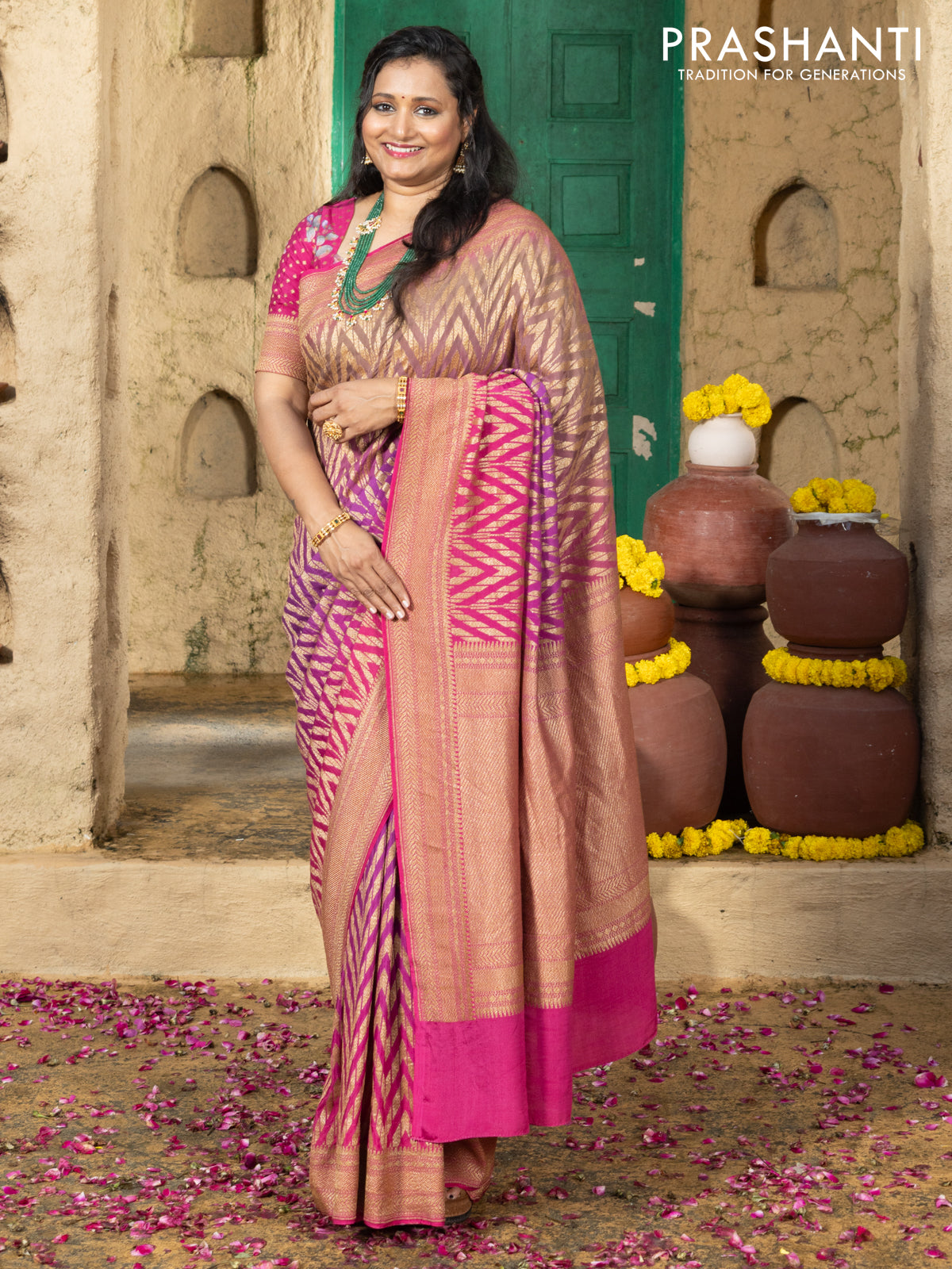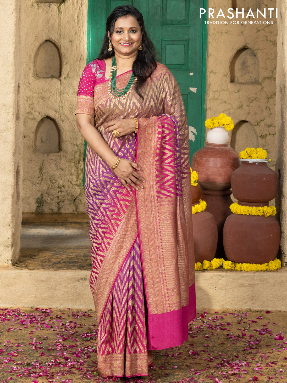 Pure banarasi georgette saree pink and purple with allover geometric weaves and woven border & floral blouse