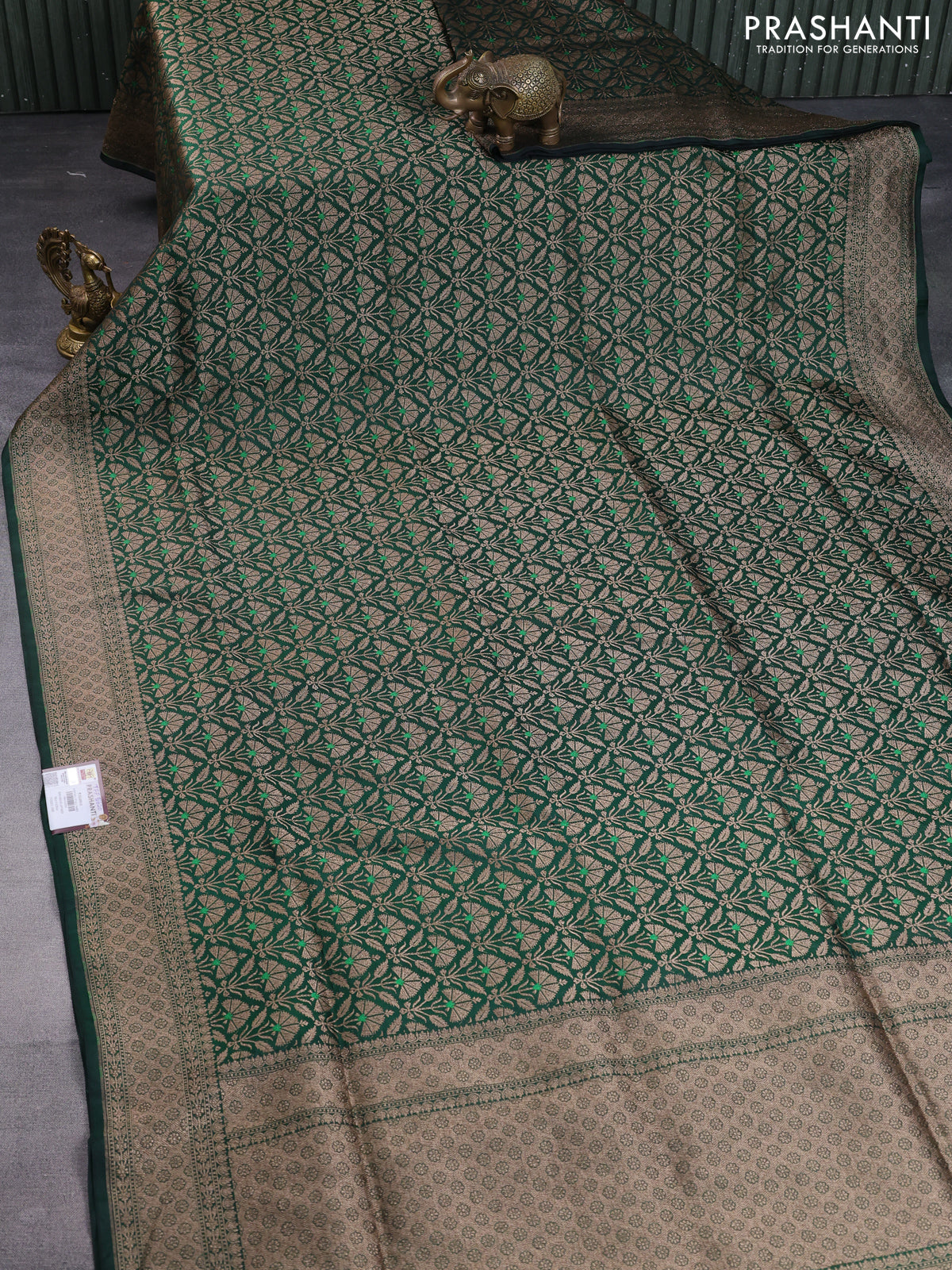 Pure banarasi uppada silk saree bottle green with allover brocade weaves and woven border