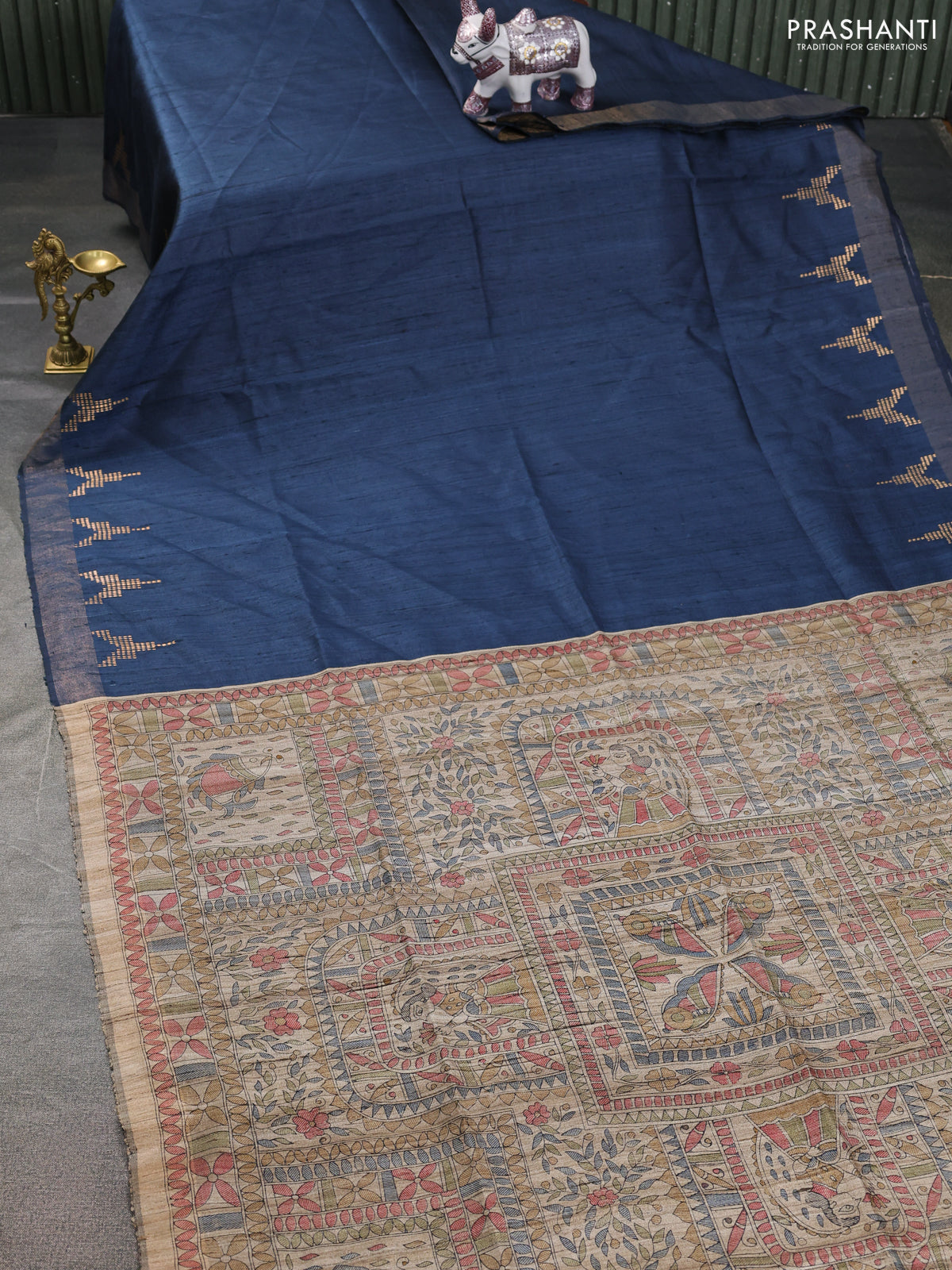 Pure dupion saree peacock blue and beige with plain body and madhubani printed pallu & blouse