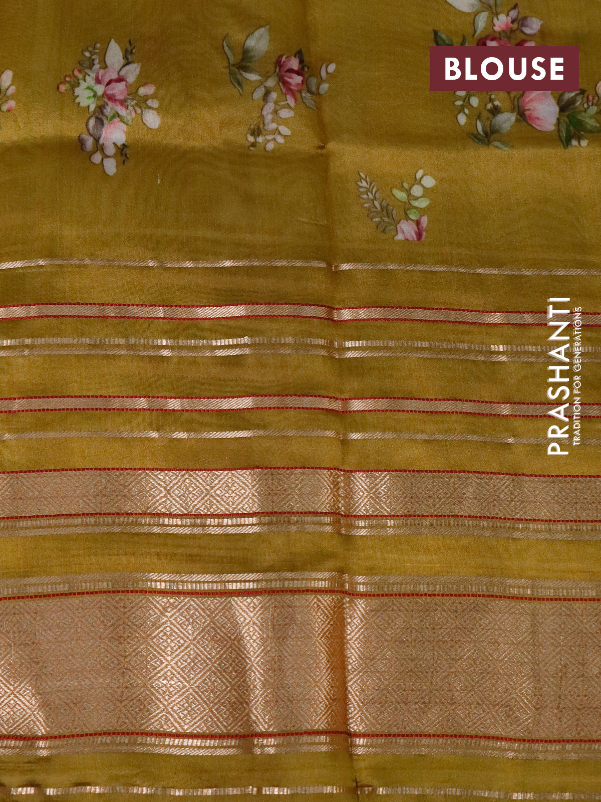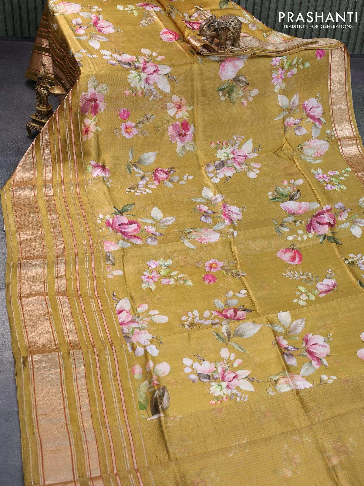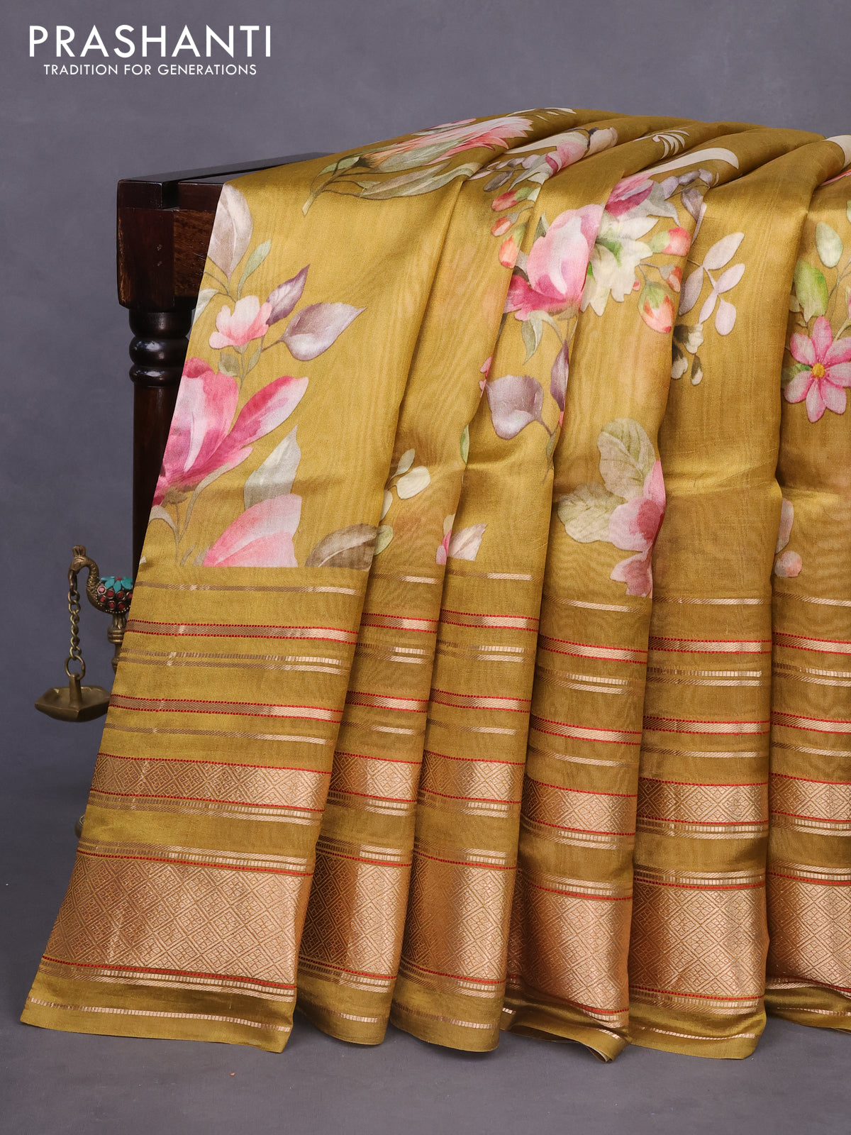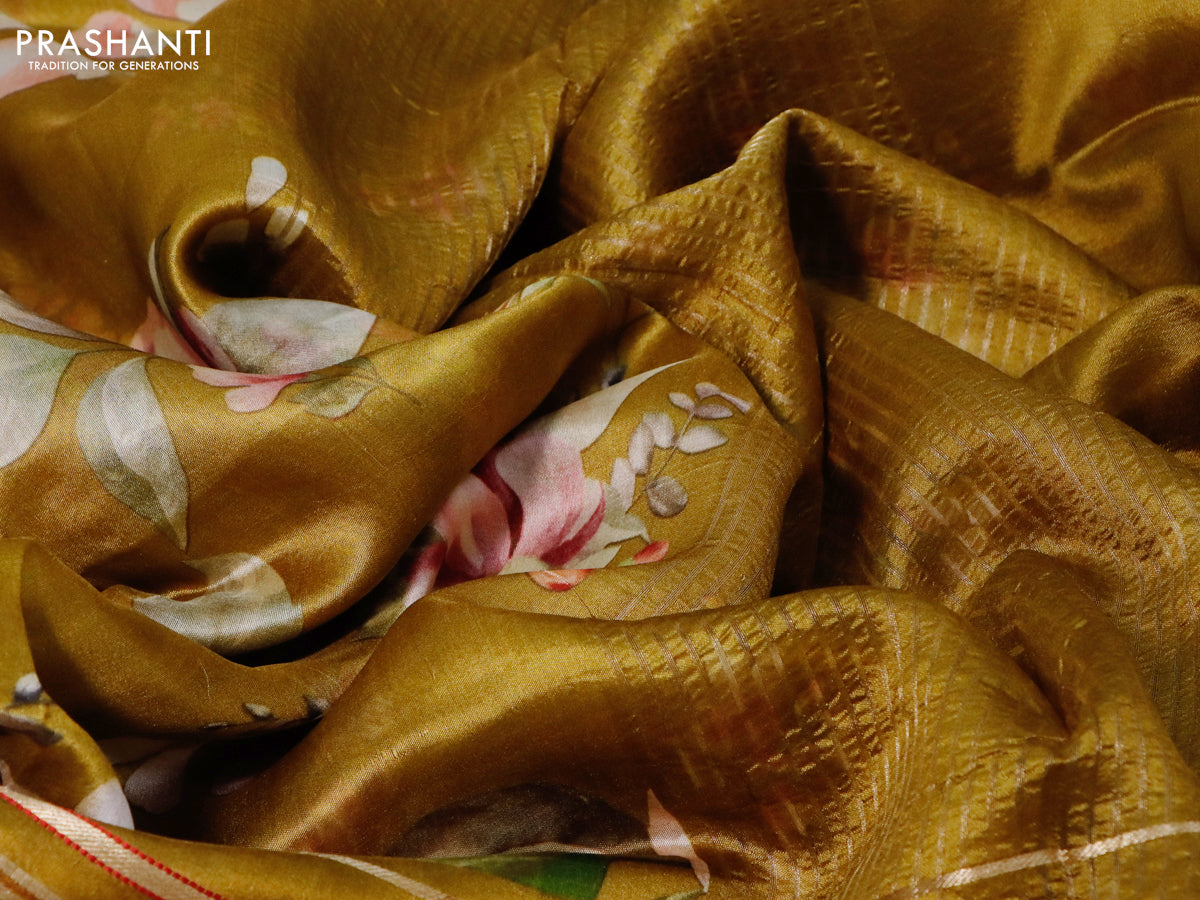 Pure dupion silk saree dark mustard with allover floral prints and long zari woven border